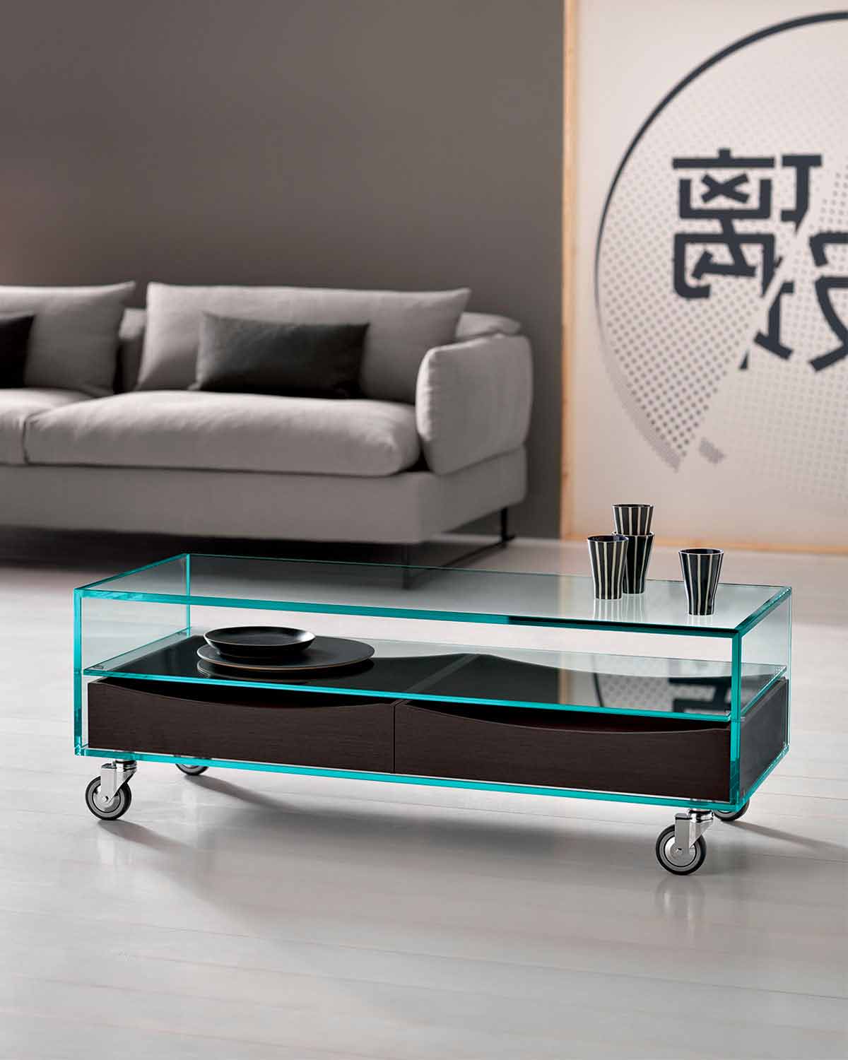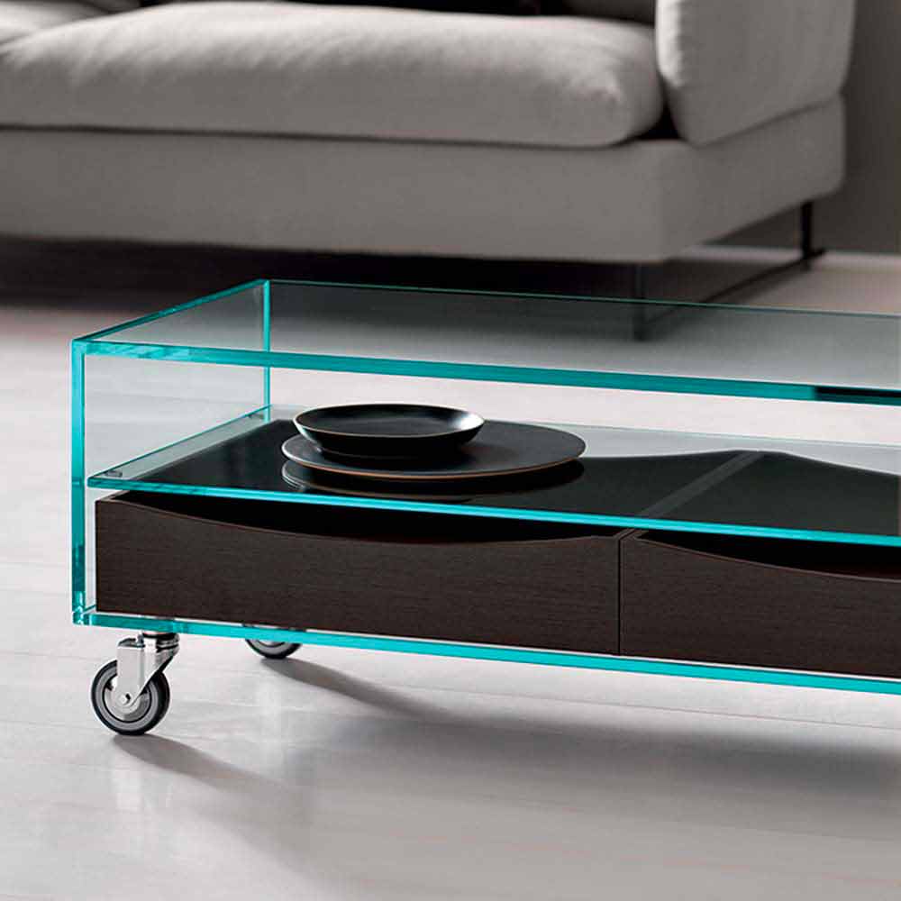 Stue sofabord i moderne stil på hjul i extraclear glas med to wengè-træskuffer, fremstillet i Italien.