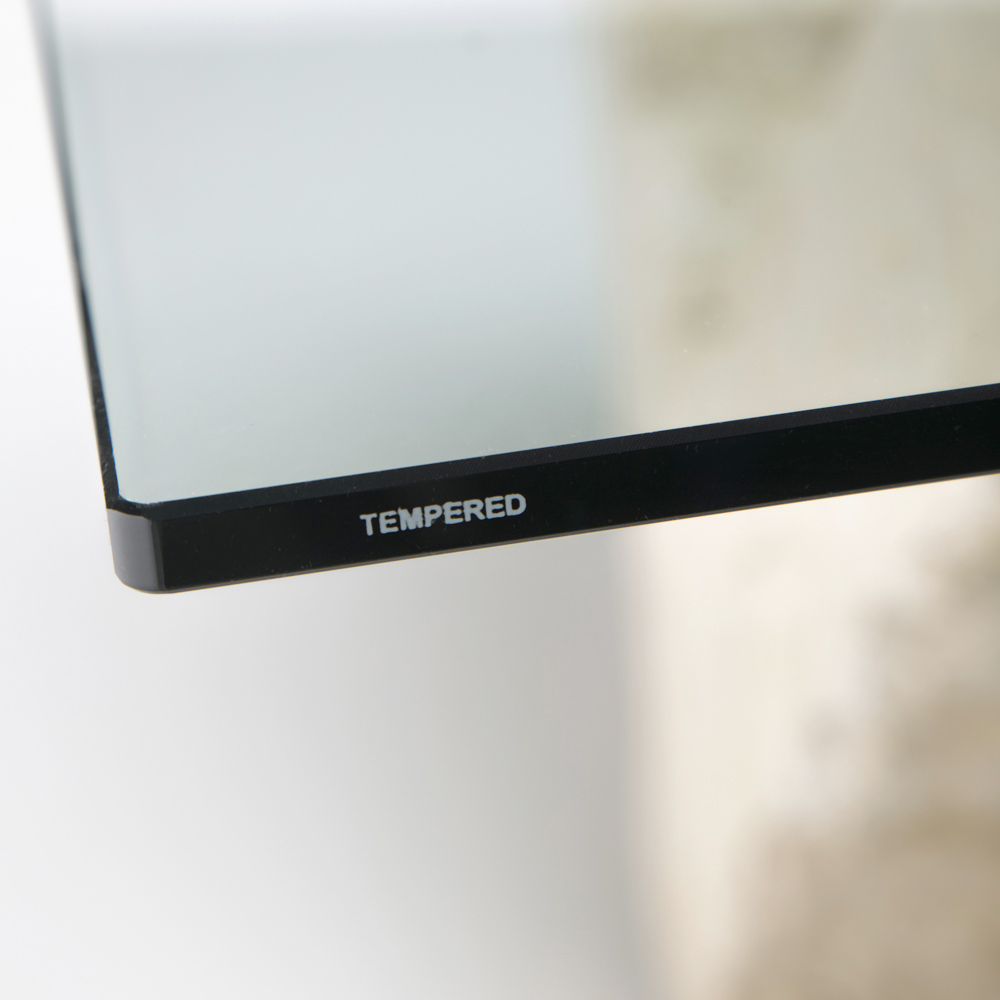 Sofabord med hvid fossil stenstruktur og 10 mm poleret glasplade.