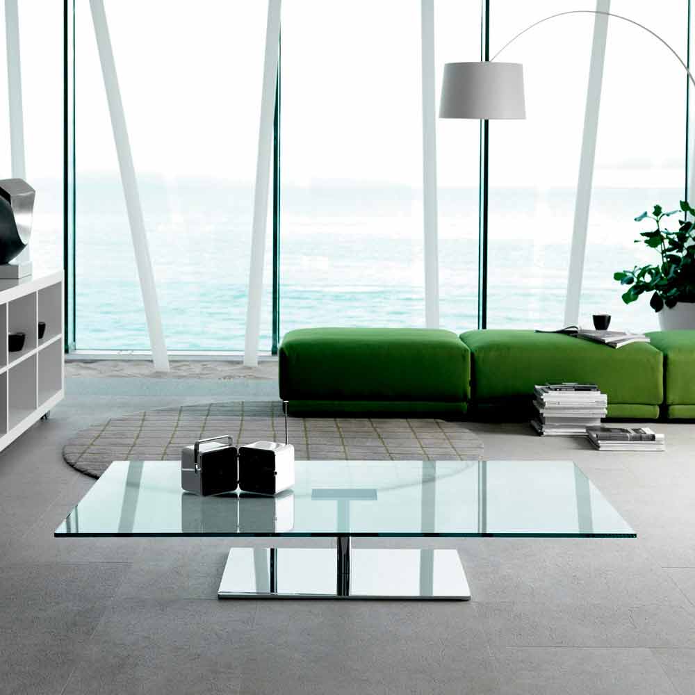 Dette lave sofabord til stuen med et rektangulært design er kendetegnet ved toppen lavet udelukkende af glas og en metalunderstøtningsfod i en krom- eller kanonfinishfinish, der skaber vidunderligt lys og tredimensionelle effekter.