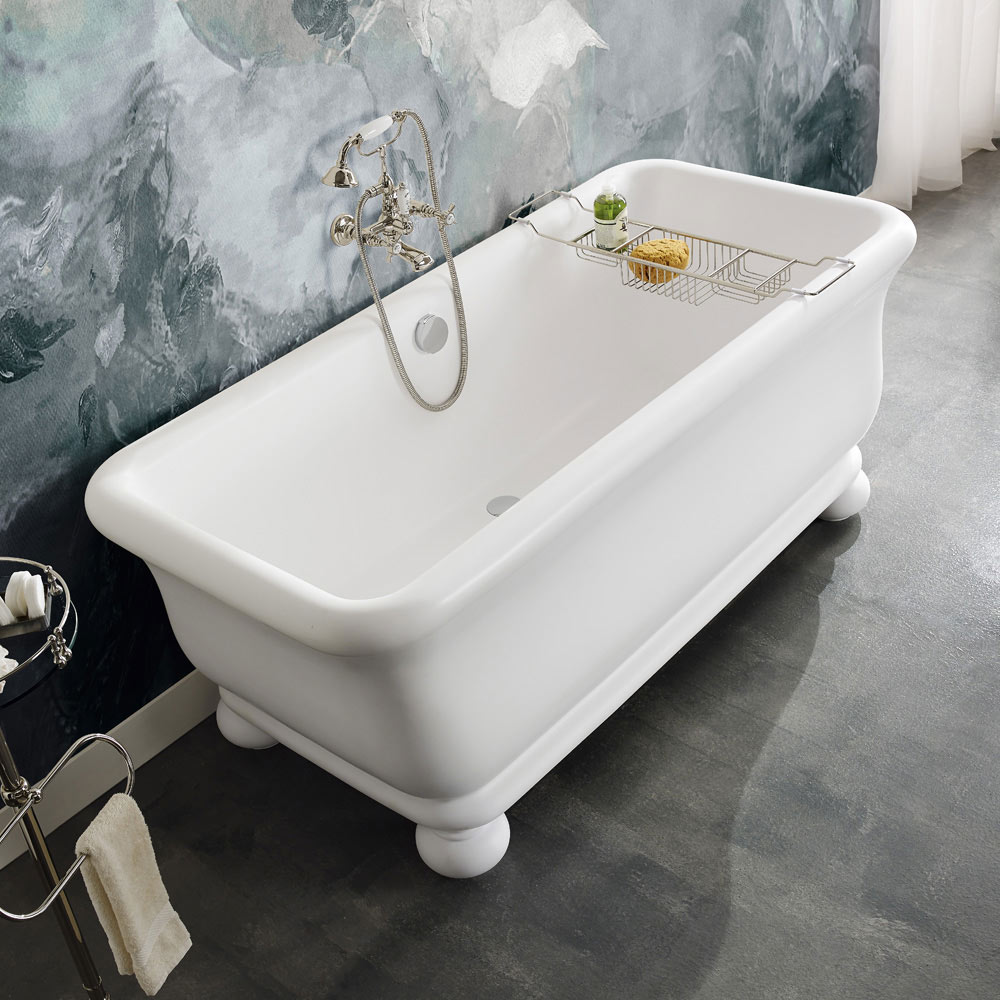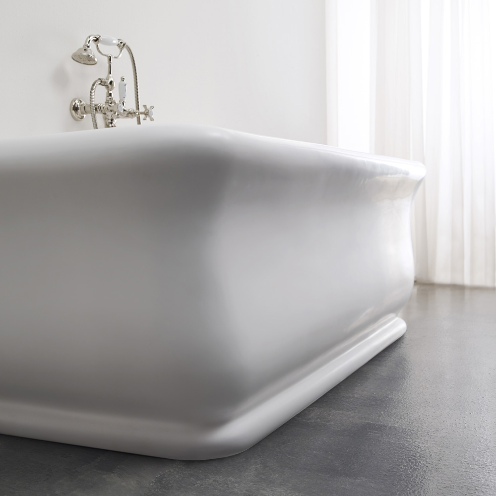 Rektangulært hvidt badekar i Solid Surface, en blanding af akrylharpiks modificeret med mineralske forbindelser, med overløb til affaldssøjle. Originalt 4-fods forhøjet badekar i valgfri fast overflade . Vælg mellem mat eller blank hvid.