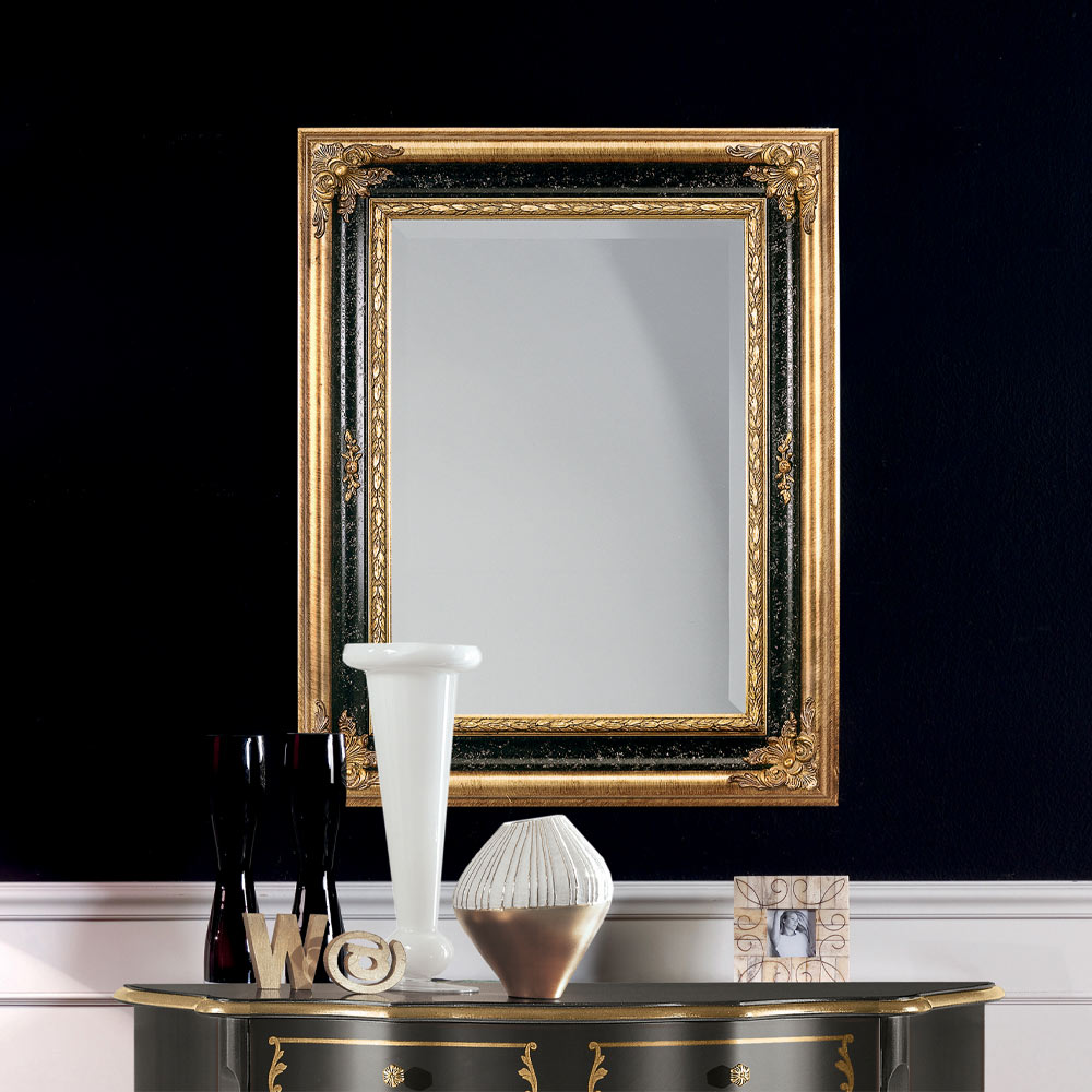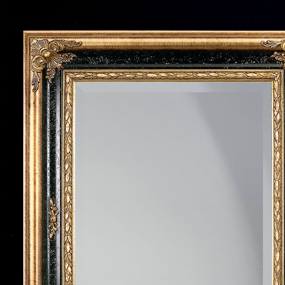 Elegant rektangulært spejl med træramme dekoreret med bladguld og sort lak. Takket være sin klassiske stil er dette spejl ideelt til at give ethvert rum et elegant og luksuriøst præg.
