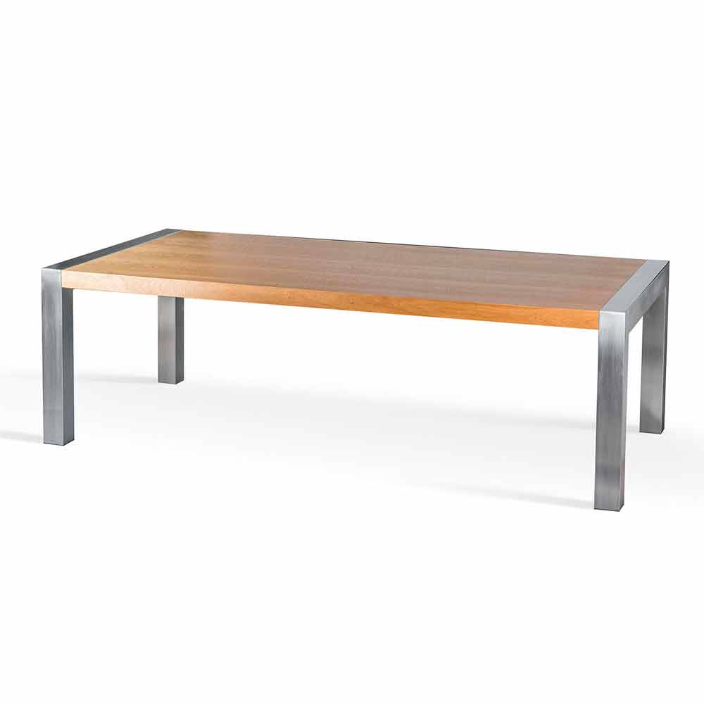 Rektangulært spisebord med top i poleret egetræ og stålben.