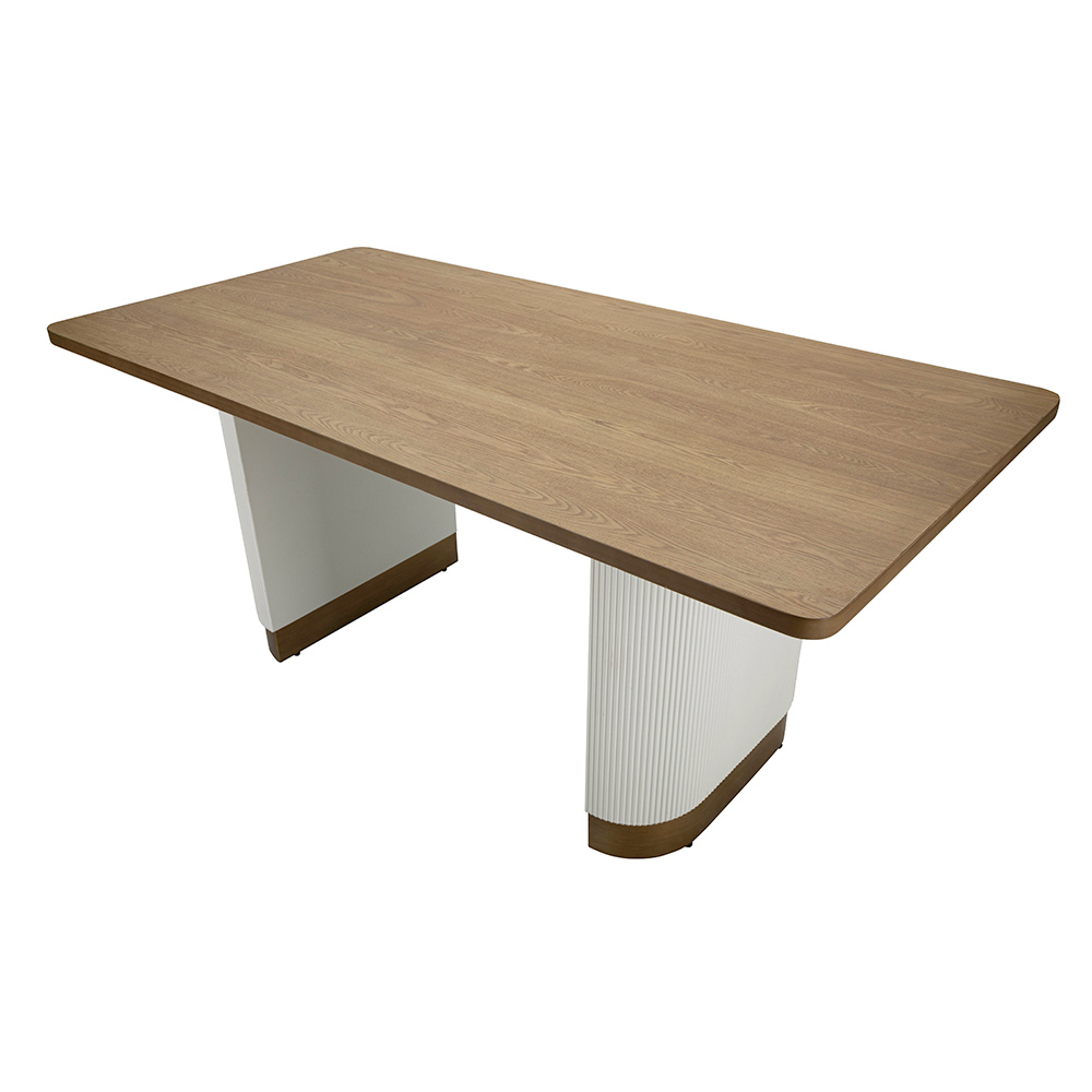 Dette spisebord er en upåklagelig syntese af stil og funktionalitet , et møbel designet til at berige ethvert miljø med dets diskrete, men alligevel karakteristiske tilstedeværelse. MDF-overfladen, med varme naturlige toner, kontrasterer harmonisk med den hvide base med lodrette riller, og tilbyder en raffineret visuel tekstur og et design inspireret af elementerne i klassisk arkitektur.