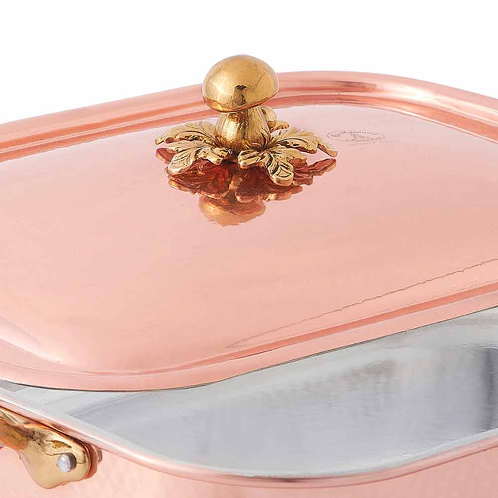 Rektangulær stegeovn med kobberlåg og messinggreb, fint design lavet i Italien.
