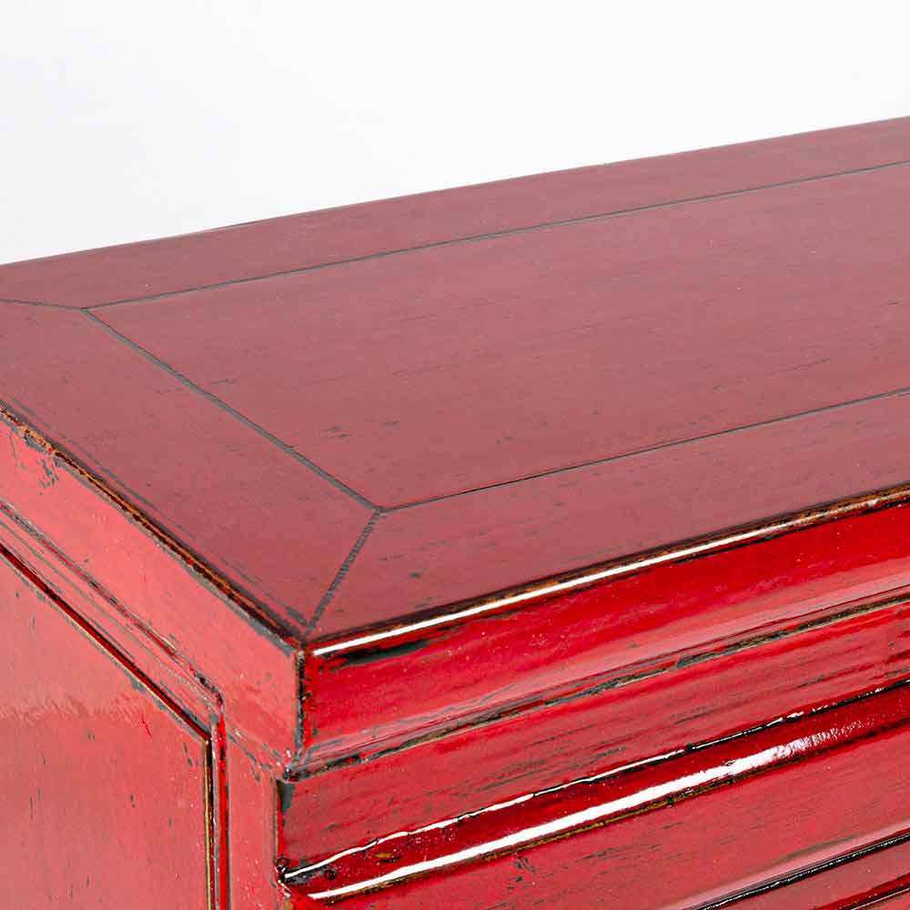 Rød konsolbord i almetræ med 3 skuffer i vintage design.