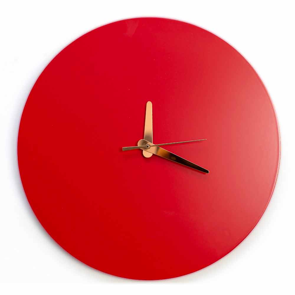 Vægur i rød og bronze lakeret træ, rundt og moderne design, lavet i Italien.