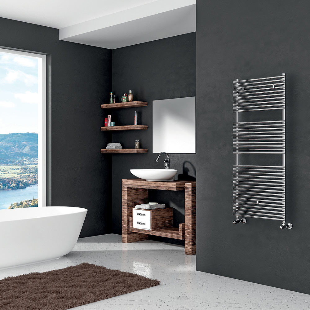 Forkromet hydraulisk rørformet håndklædevarmer i moderne design, fremstillet i Italien.