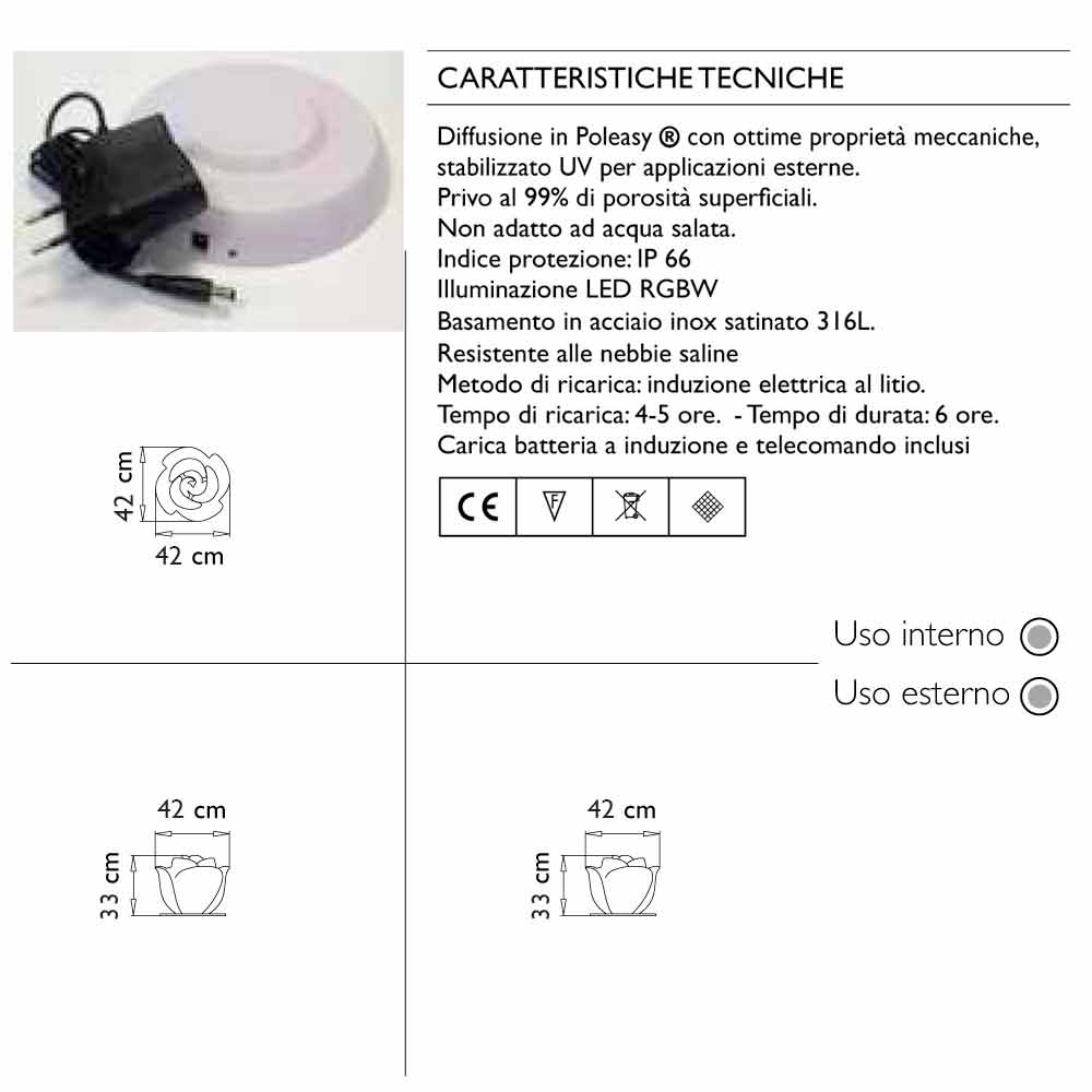 Praktisk, let at håndtere, stemningsfuld, Baby Love Waterproof er let i vandet, men også i enhver anden udendørs installation takket være IP64-beskyttelsen og 316 rustfrit stålbase i satin, der forhindrer det i at vælte.