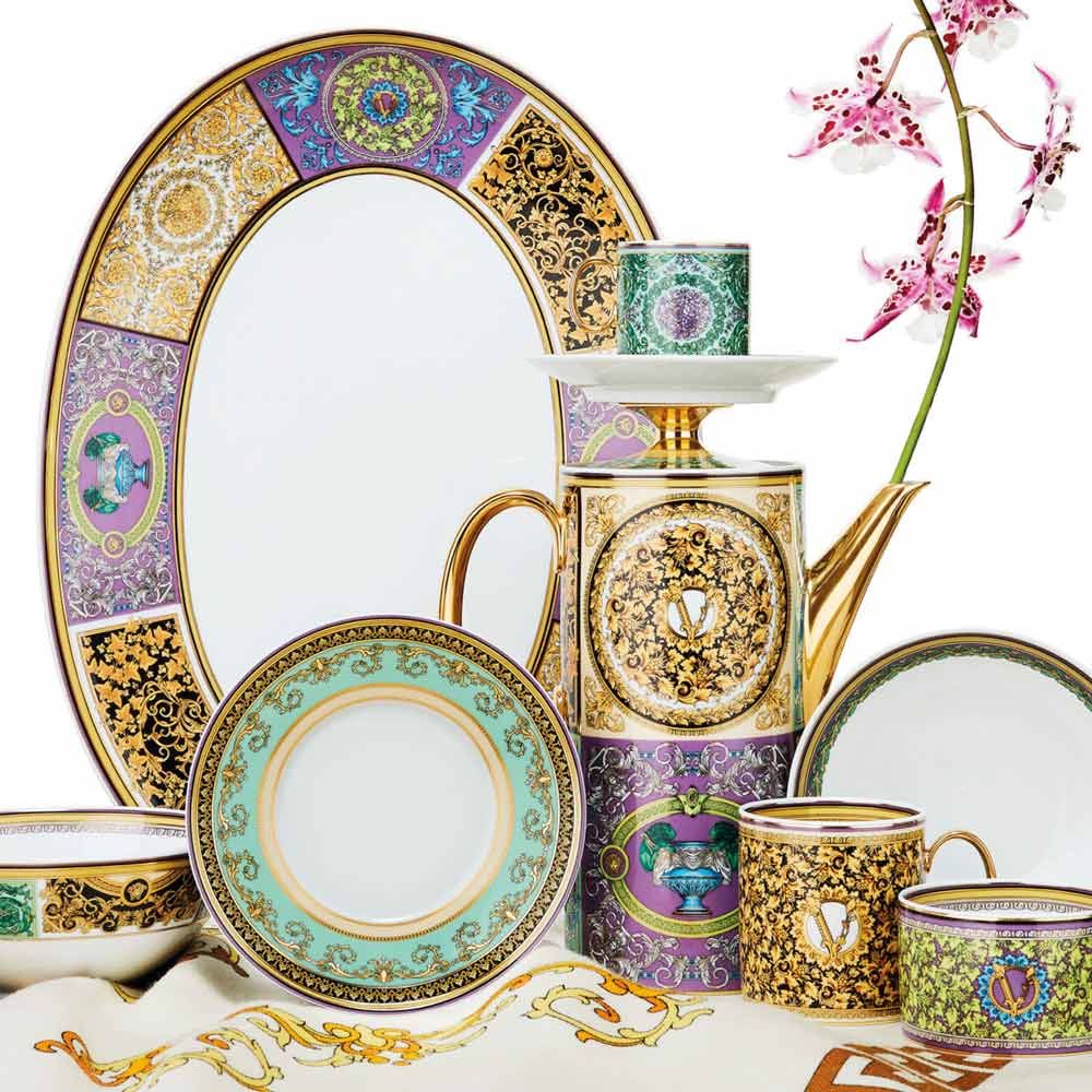 Dette Barocco Mosaic krus fra Versace , lavet af fint porcelæn , repræsenterer den perfekte balance mellem klassisk elegance og moderne stil. Dens eksklusive design kombinerer gyldne barokmotiver med det ikoniske Medusa- symbol, beriget med indviklede detaljer og en raffineret farvepalet, der afspejler husets tidløse luksus.