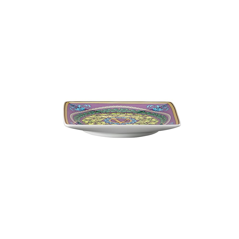 Denne skål er perfekt til at pynte dit bord med et strejf af tidløs glamour , ideel til at servere desserter, forretter eller små snacks med stil. Hver detalje, fra blomstermotiver til de gyldne kanter, afspejler Maison Versaces fortræffelighed og umiskendelige håndværk.