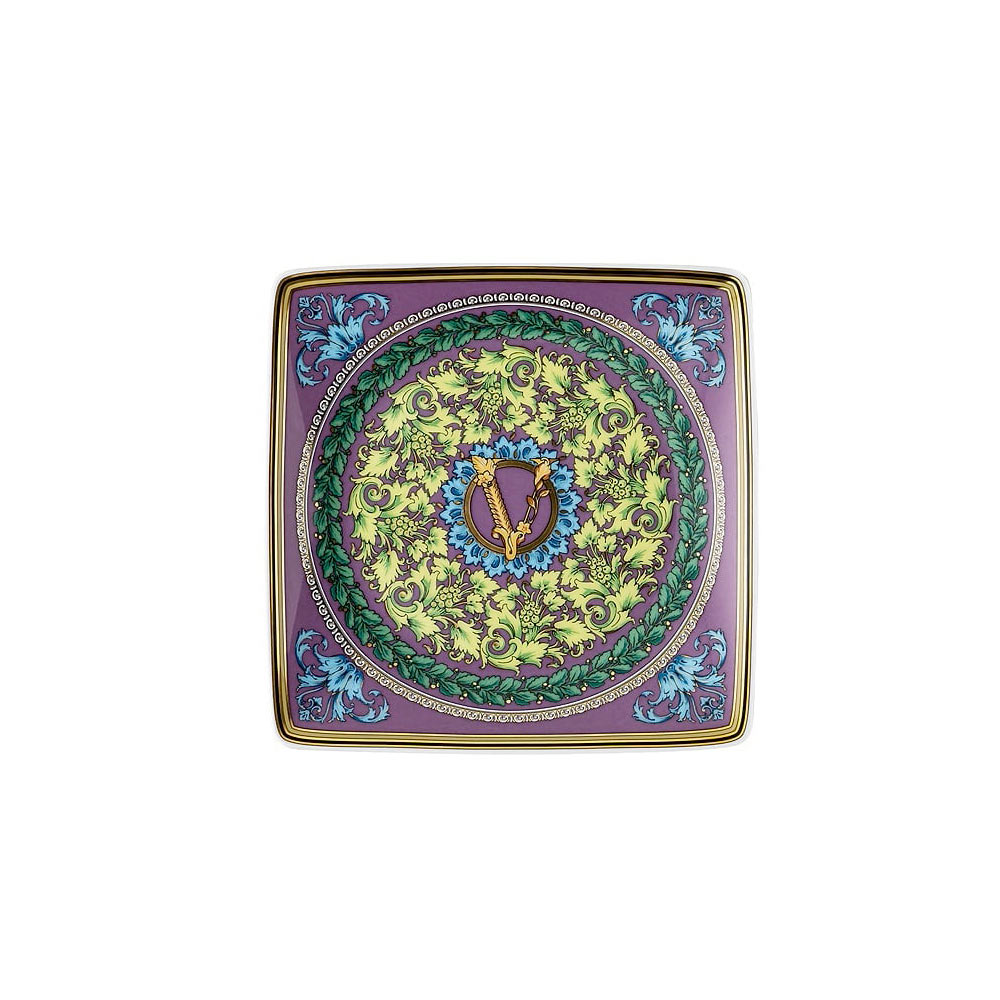 Barocco Mosaic skålen fra Versace , i fint porcelæn , er en fantastisk fejring af italiensk kunst og luksus . Dens fængslende design byder på en indviklet barokmosaik, beriget af levende nuancer af lilla, grøn og blå, der harmonisk fletter sig sammen omkring det centrale Versace "V" -symbol, et emblem af elegance og raffinement.