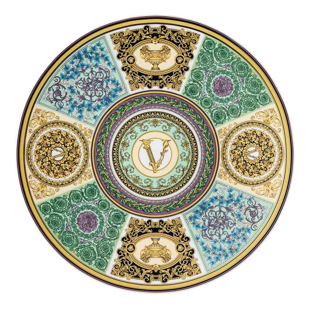 Barocco Mosaic dækkeserviet fra Versace , lavet af fint porcelæn , er et sandt mesterværk af italiensk kunst og design . Dette unikke stykke kombinerer mesterligt en række ikoniske motiver fra huset, inklusive den legendariske Medusa , barokke ornamenter og indviklede mosaikker i lyse farver. Dens raffinerede æstetiske og gyldne detaljer skaber en effekt af absolut overdådighed og sofistikering .
