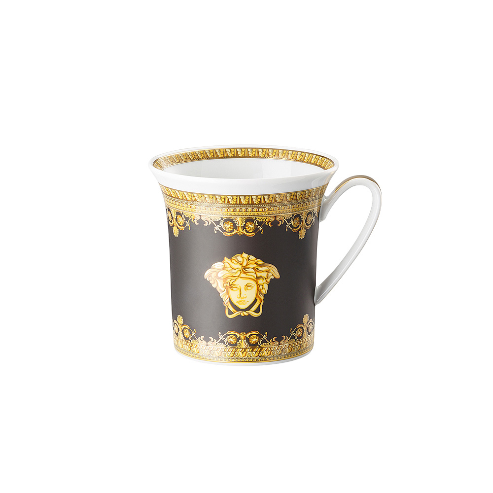 I Love Baroque-glasset fra Versace , lavet af fint porcelæn , er et ikon for tidløs elegance og luksus . Den har et indviklet design og kombinerer Medusas ikoniske ansigt med gyldne barokornamenter, der harmonisk fletter sig sammen på en sort eller hvid baggrund, hvilket skaber en visuel effekt med stor effekt og raffinement.