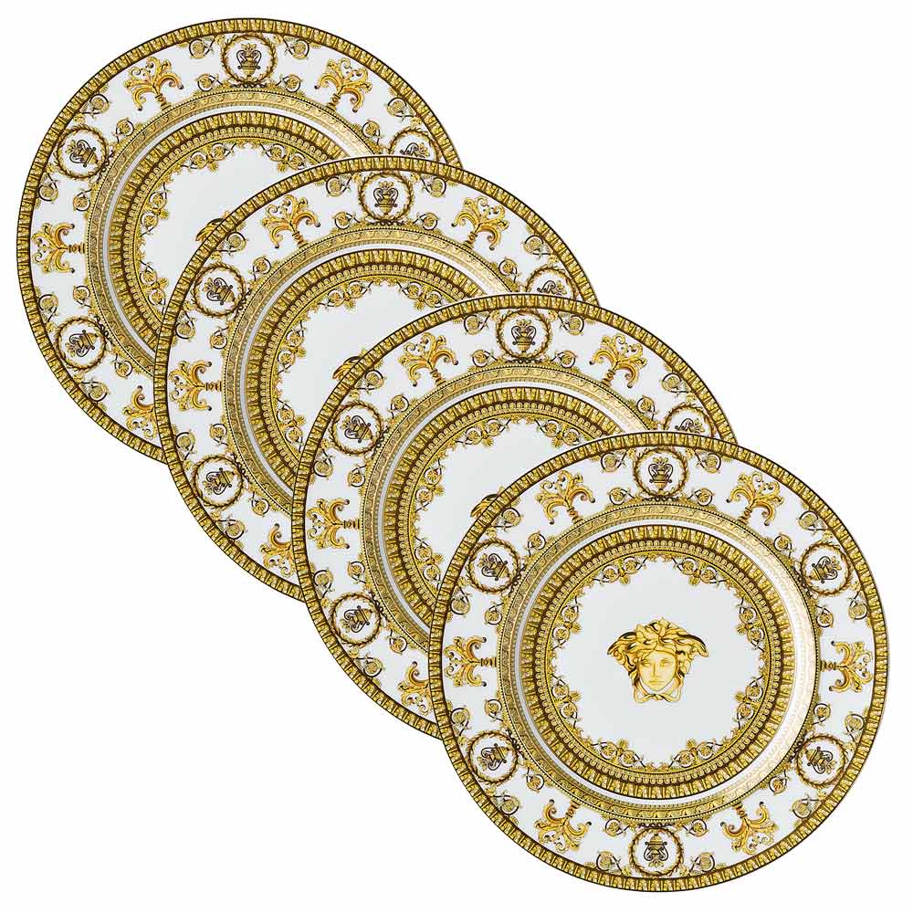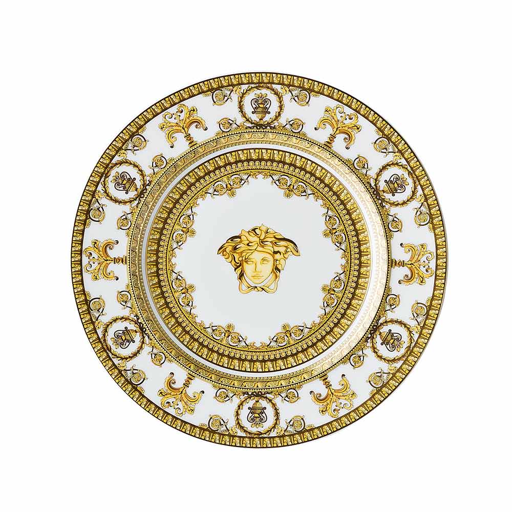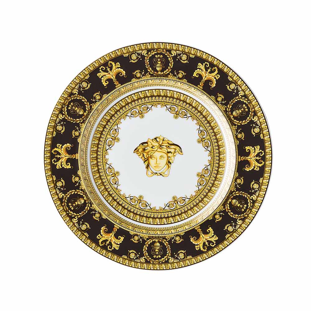 Versace I Love Baroque Bread Plate , lavet af fint porcelæn , er en ode til den tidløse sofistikering og overdådighed, der er typisk for huset. Det indviklede design har gyldne barokmotiver, der elegant fletter sig sammen på en sort eller hvid baggrund, hvilket skaber en kontrast, der fremhæver det ikoniske Medusa- ansigt i midten. Hver detalje er en hyldest til Versaces luksus og håndværk .