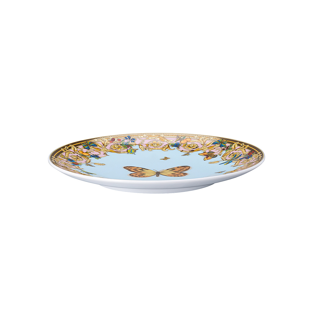 Denne charmerende porcelænstallerken har et lyst og farverigt design, der straks fanger øjet, hvilket gør den til et samlerstykke såvel som et raffineret service. En elegant sommerfugl skiller sig ud i midten, omgivet af en delikat ornamental kant med blomster og arabesk motiver, på en rolig blå baggrund.