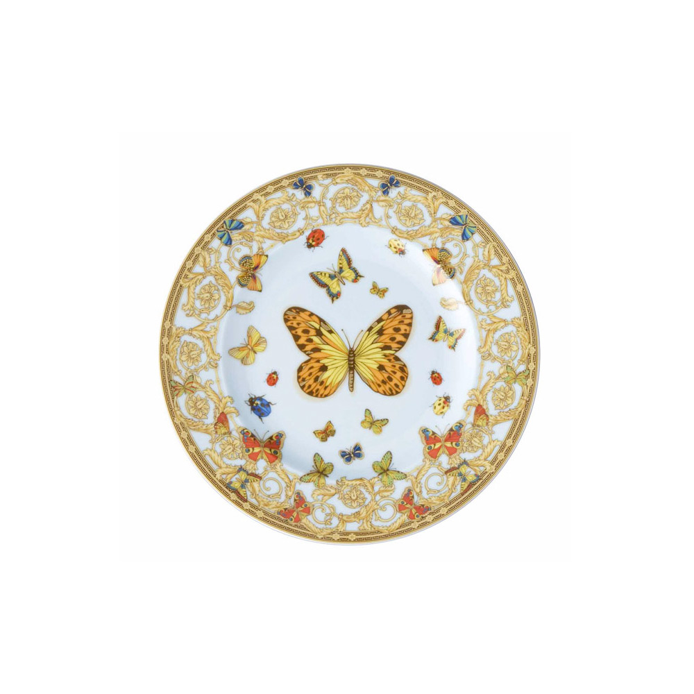 Denne charmerende porcelænstallerken har et lyst og farverigt design, der straks fanger øjet, hvilket gør den til et samlerobjekt såvel som et raffineret service. En elegant sommerfugl skiller sig ud i midten, omgivet af en delikat ornamental kant med blomster- og arabeskmotiver.