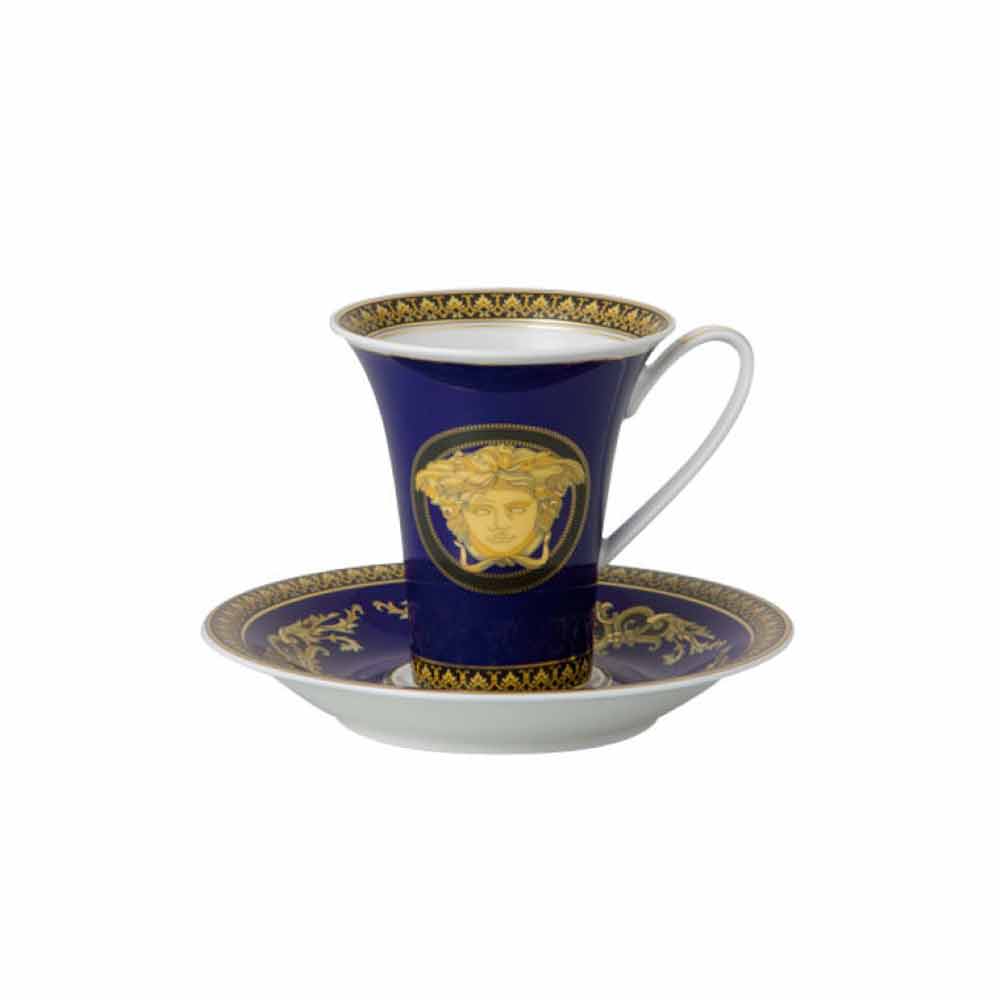 Den meget stilfulde høje kaffekop og underkop fra Versace er en del af den elegante moderne kollektion, der kombineret med en fascinerende og raffineret glamour minder om tidligere tider og kommer til udtryk i den lyse blå nuance og tager navnet Medusa Blue.