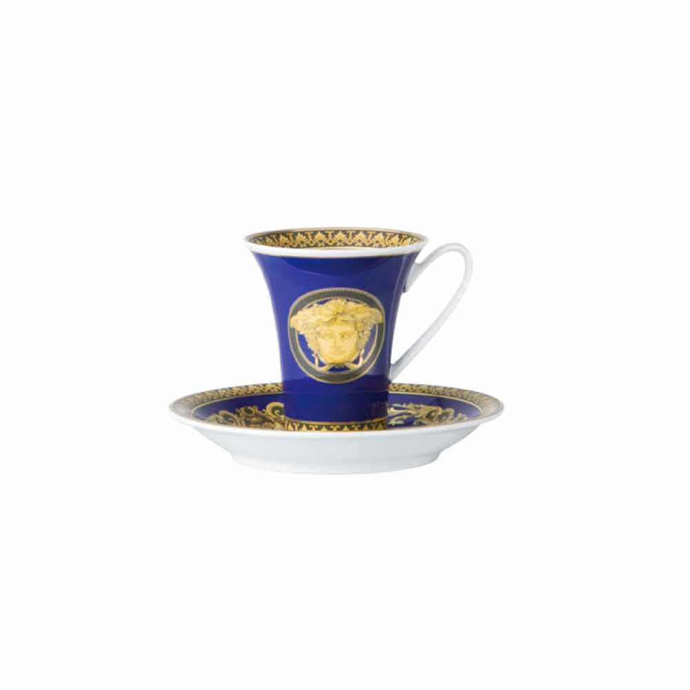 Den meget stilfulde kaffekop og underkop fra Versace er en del af den elegante moderne kollektion, der kombineret med en fascinerende og raffineret glamour minder om tidligere tider og kommer til udtryk i den lyse blå nuance og tager navnet Medusa Blue.