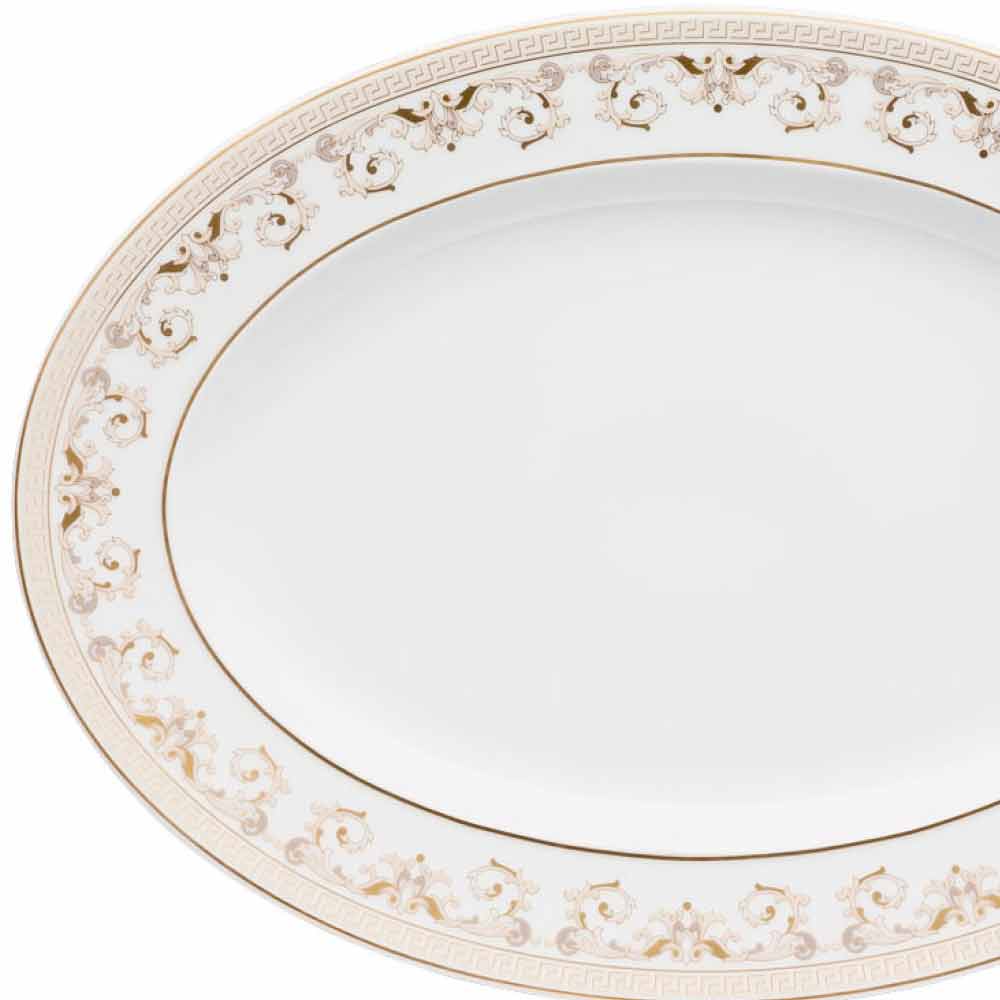 Den ovale tallerken på 34x24,5 cm fra Versace er en del af den raffinerede og luksuriøse Medusa Gala-bordkollektion.