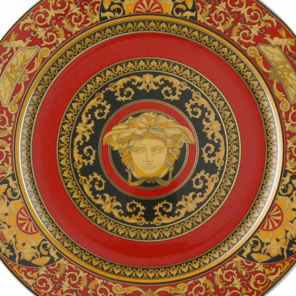 Det fantastiske Versace sted eller vægplade er en del af Medusa Rosso -linjen, som består af to eller tre nuancer: en elegant rød og den meget dyrebare guld og sort; som når de kombineres danner et raffineret motiv, der transporterer dig til fascinerende og fjerne epoker.