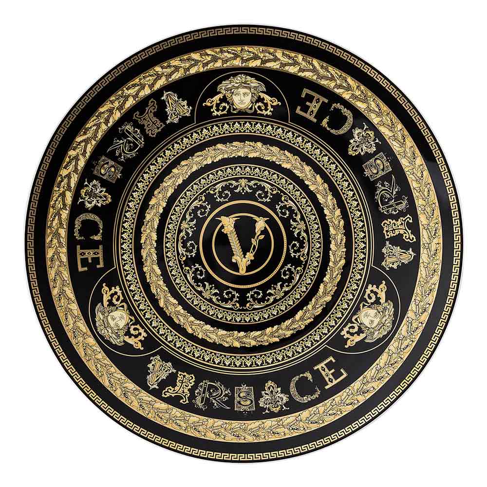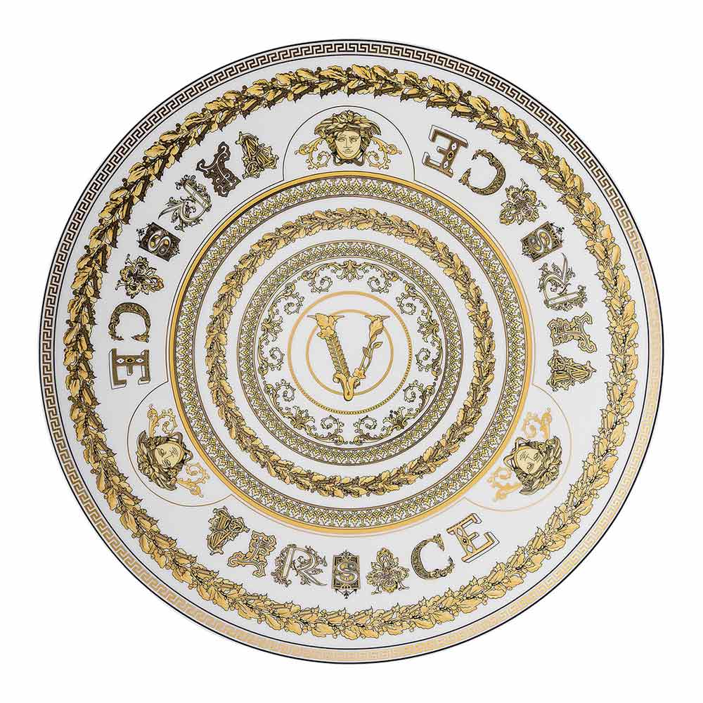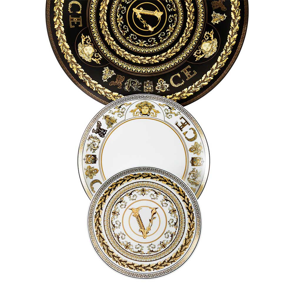 Virtus Gala dækkeserviet fra Versace er en sand fejring af luksus og raffinement , lavet af ædle porcelæn . Dens karakteristiske design kombinerer blank farve med visuelt slående gulddekorationer , beriget med barokke detaljer og det ikoniske Versace "V"-logo, et symbol på tidløs elegance.