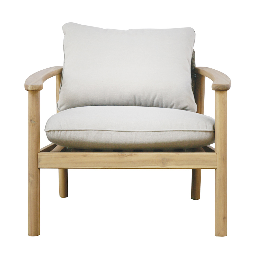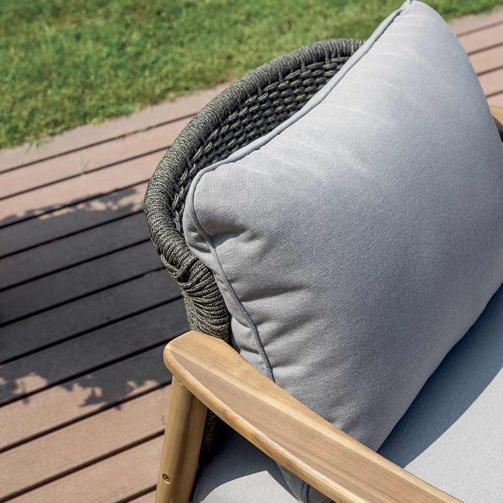 Rammen i akacietræ giver soliditet og varme, mens de vævede antracitfarvede rebdetaljer tilføjer et moderne og sofistikeret præg. De aftagelige grå hynder sikrer suveræn komfort og nem vedligeholdelse, hvilket bevarer stuens raffinerede og imødekommende udseende over tid.