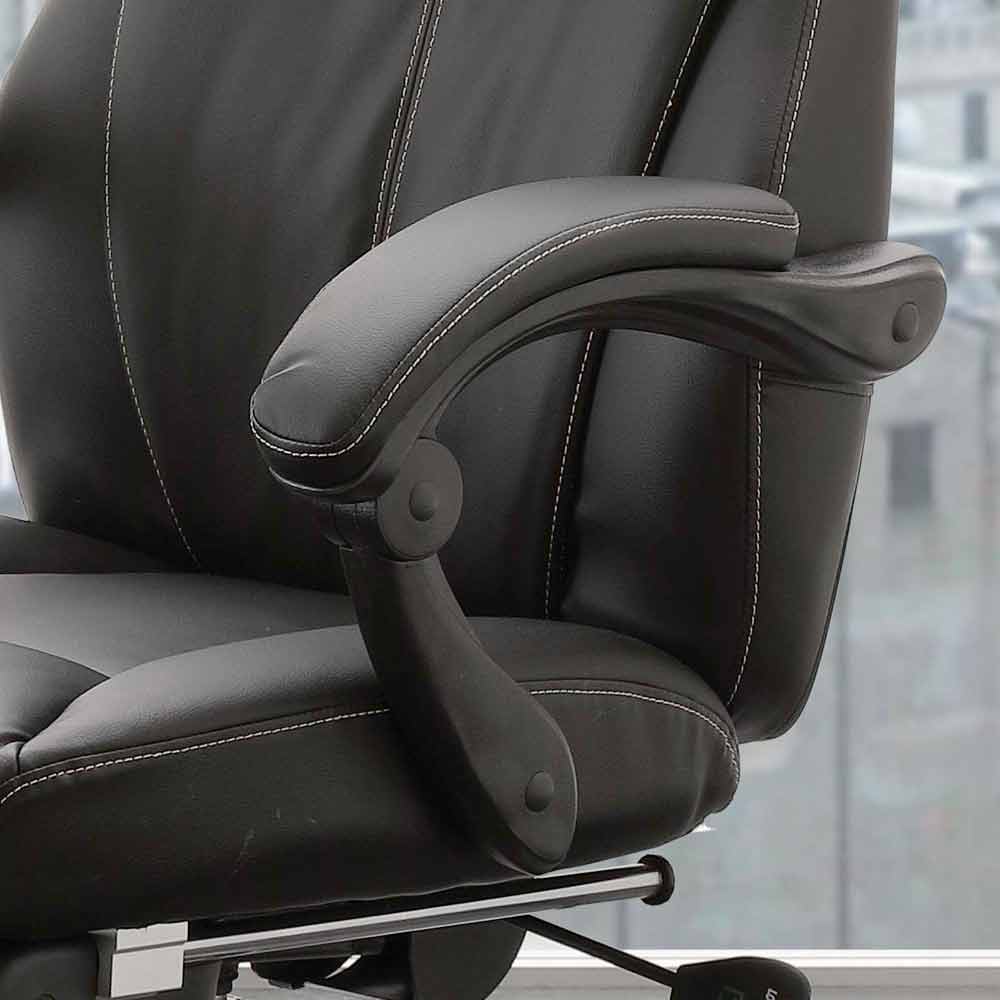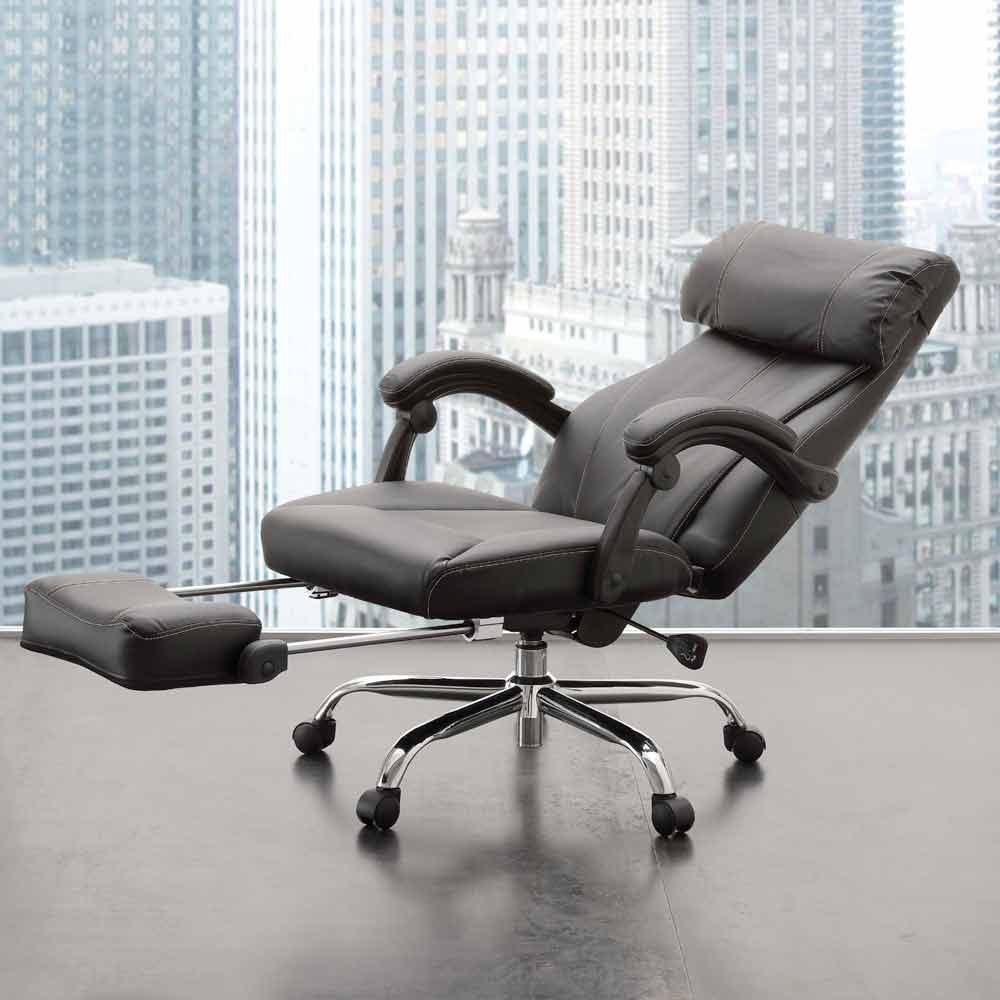Nazzareno kontorlænestol repræsenterer bedst alle disse kvaliteter; den leveres med et drejeligt sæde med gaslift, ryglæn med pude beklædt med sort kunstlæder, sæder og fodstøtte i sort kunstlæder; stel af forkromet metal med hjul.