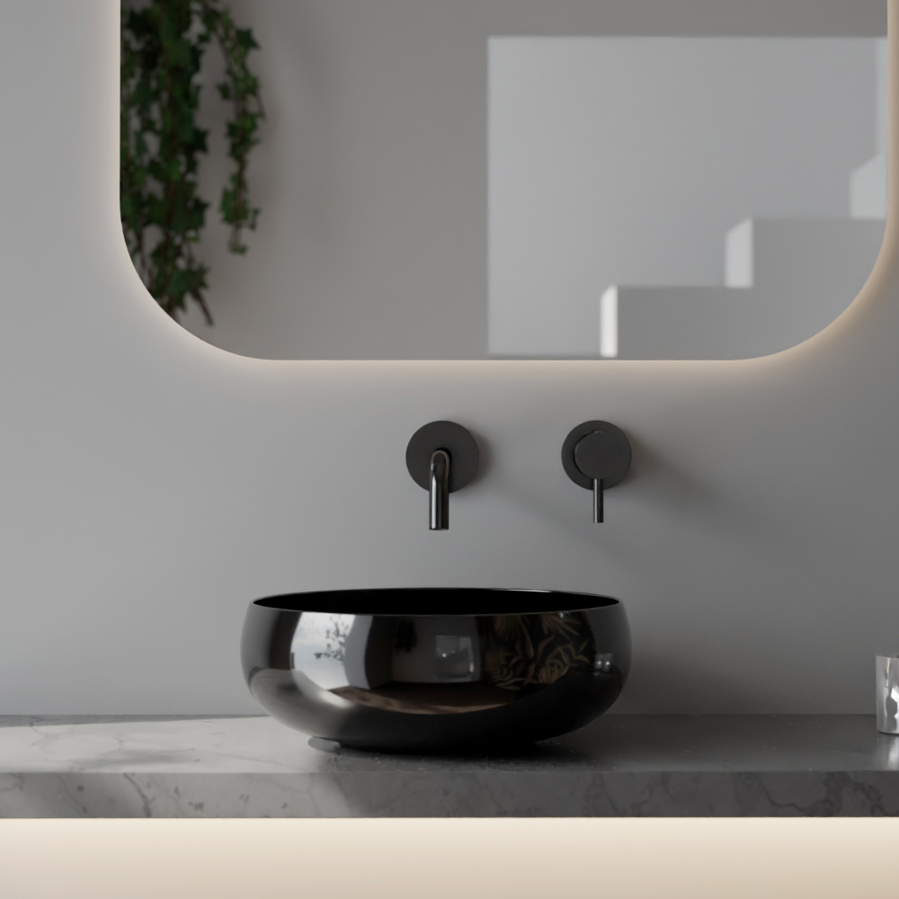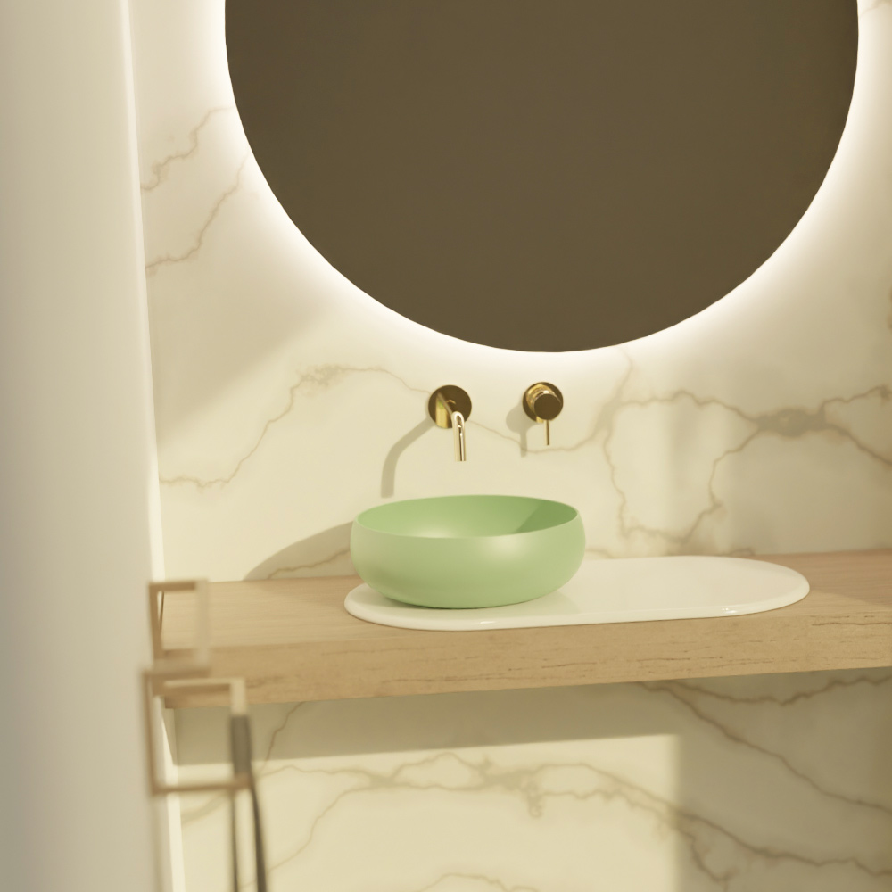 Denne runde keramiske vask er et mesterværk af minimalistisk design og funktionel elegance. Dens perfekt cirkulære form, kombineret med de sarte nuancer, der er tilgængelige, fremkalder en følelse af sindsro og renhed, og forvandler badeværelset til et fristed af ro og stil.