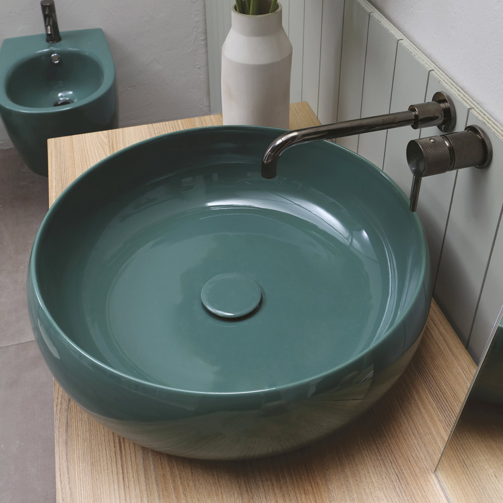 Rund bordvask lavet i Italien gennem et håndværk i blank keramik. Et originalt og elegant møbel, der præsenterer et design præget af bløde og harmoniske linjer, der giver produktet al sin samtidige personlighed og sin moderne smag . Denne håndvask er ideel til badeværelser med raffinerede og essentielle møbler og medfører en stærk scenografisk effekt takket være de vidunderlige og usædvanlige farver, der foreslås, der forvandler dens enkle æstetik til et rigtigt mesterværk.