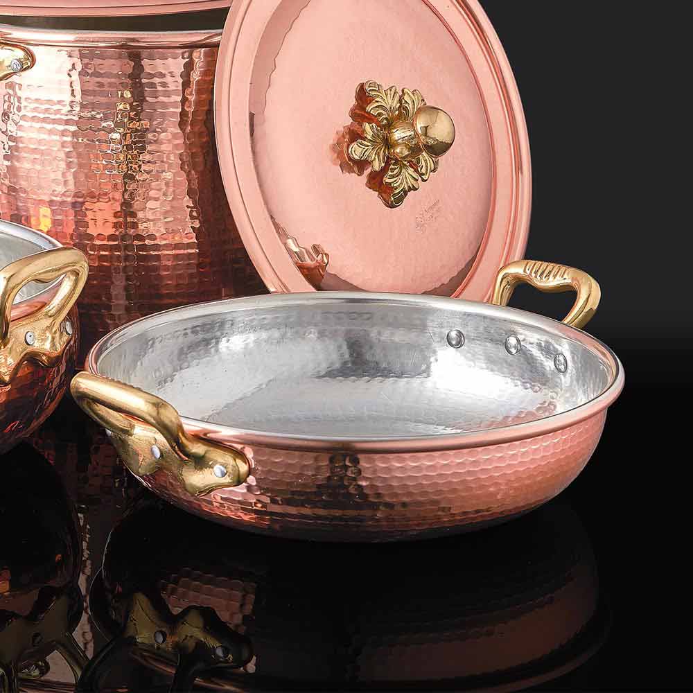Rund pande i fortinnet og håndhamret kobber med låg, lavet i italiensk design.