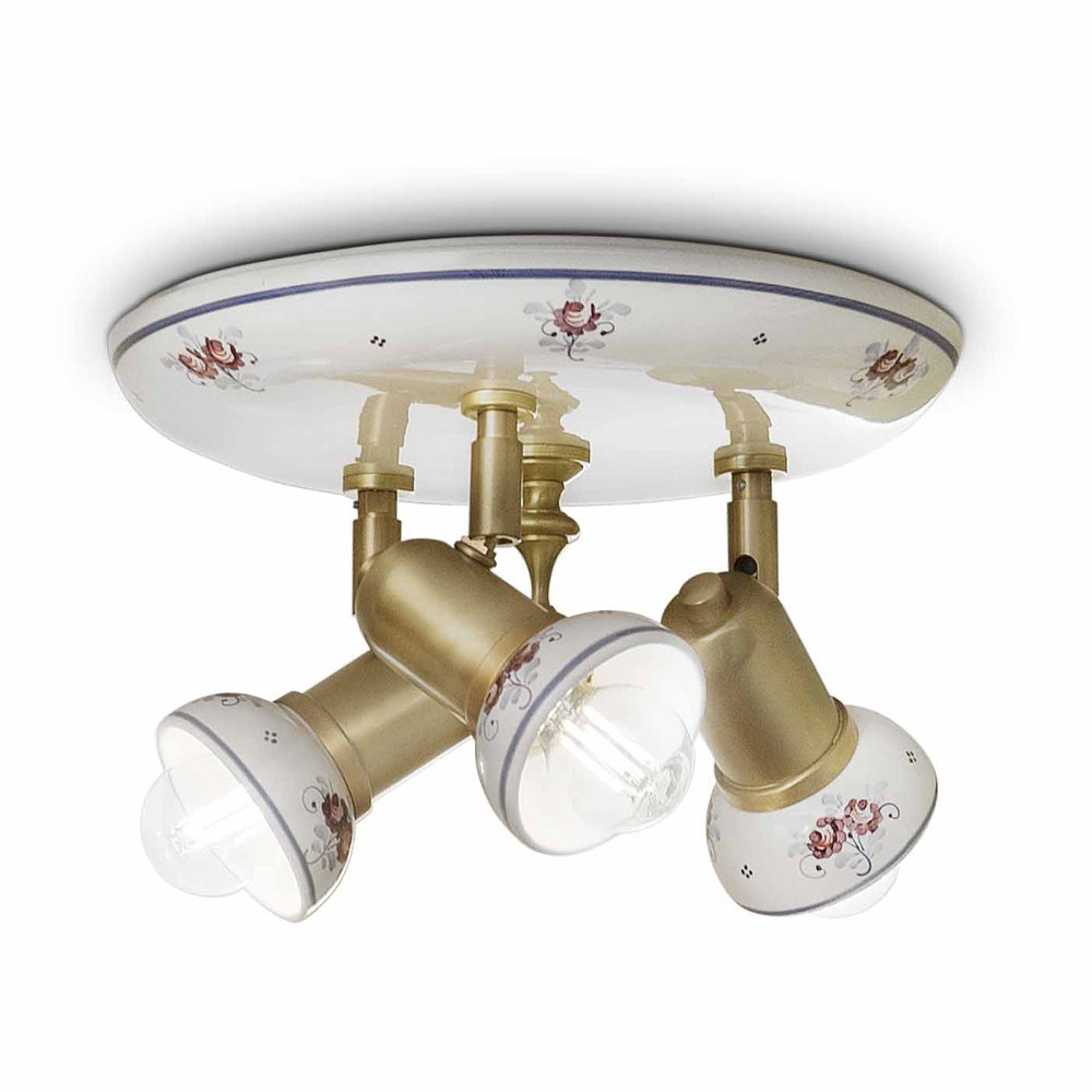 Rund 3-lys loftslampe i messing og håndmalet keramik, lavet i Italien af Ferroluce.