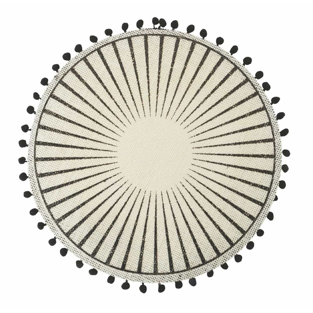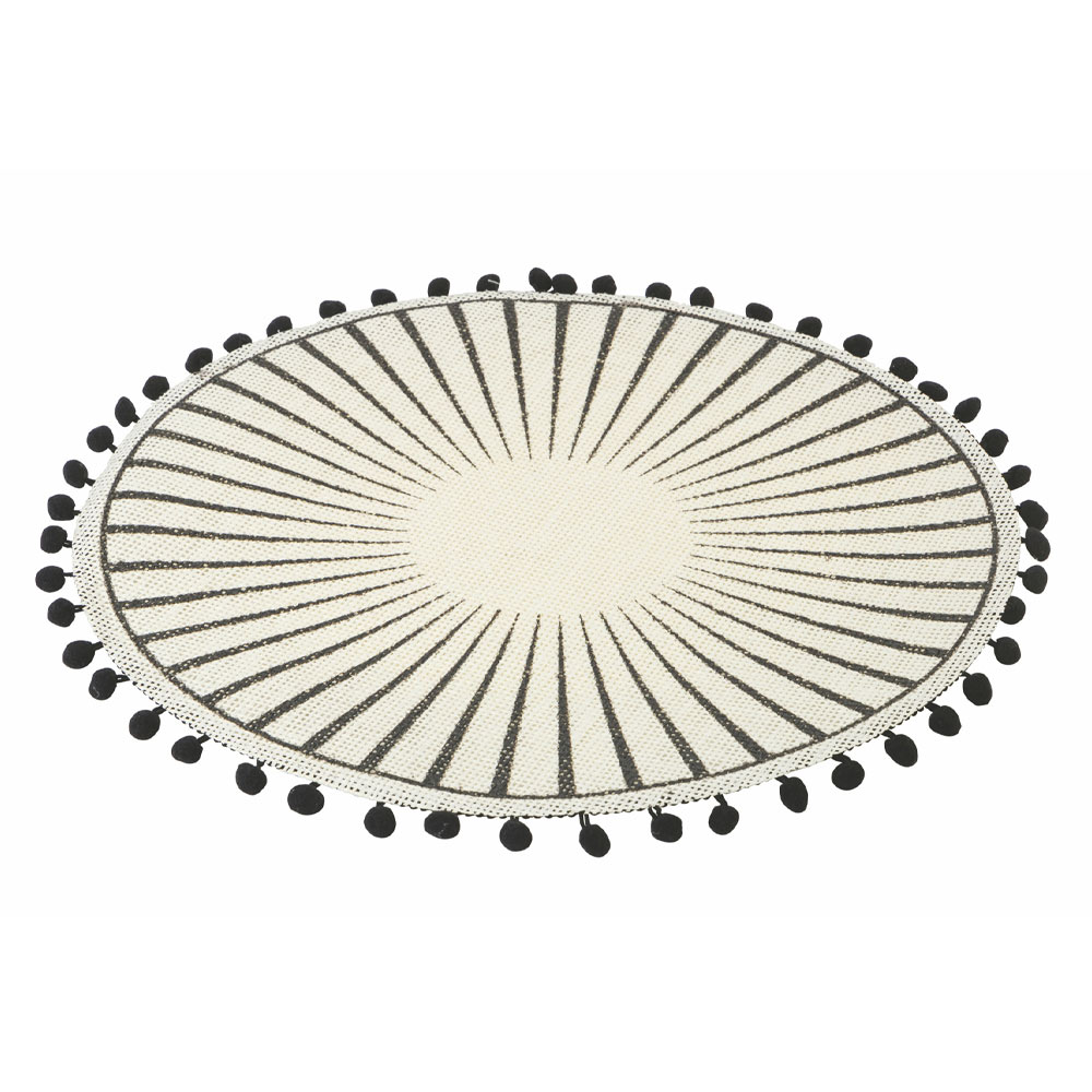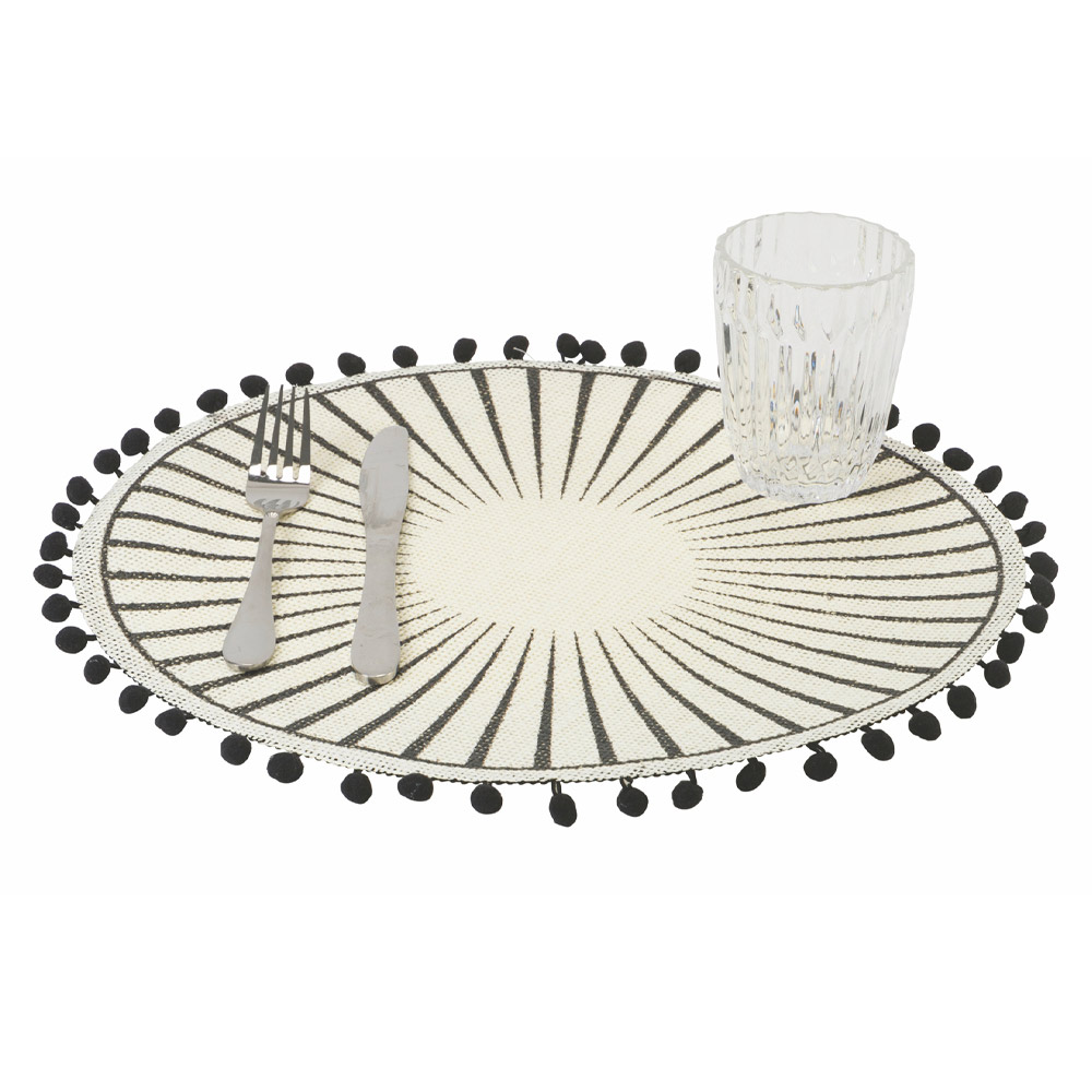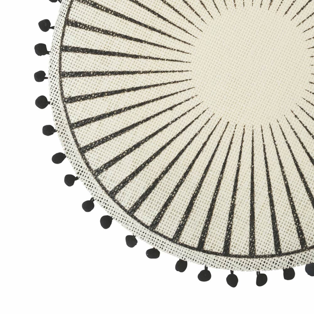 Rundt dækkeserviet sæt i hvid jute dekoreret med sorte pom poms, 12 stk.