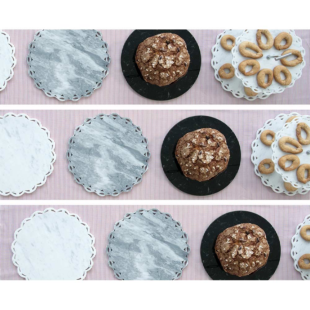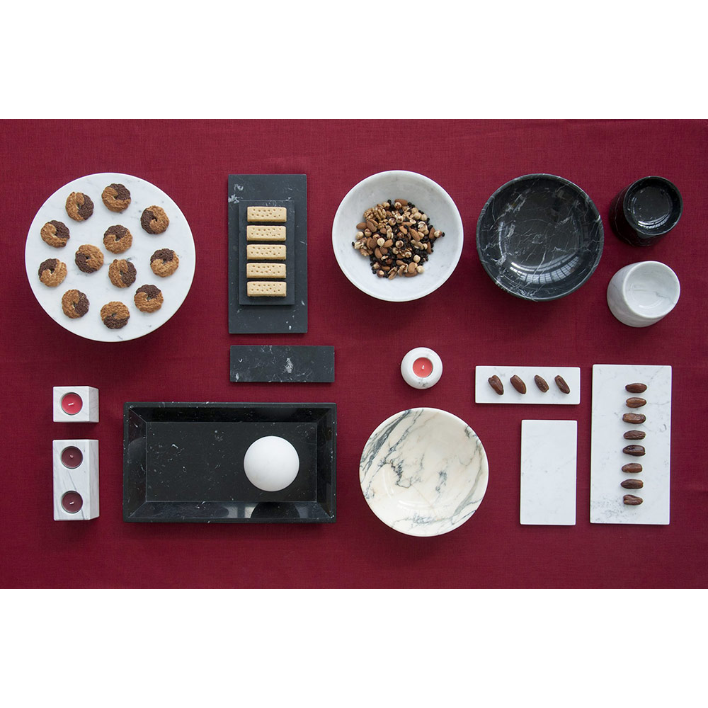 Den hvide Carrara-marmor, der blev brugt til oprettelsen af disse produkter, leveres af Poggio Silvestre-stenbruddet, en kilde til marmor af første kvalitet, der er klassificeret siden sidste århundrede, mens den sorte Marquinia-marmor er hentet fra spanske stenbrud og er kendetegnet ved sine uregelmæssige farveårer hvid eller lysegrå, som giver marmoren et originalt og moderne look.