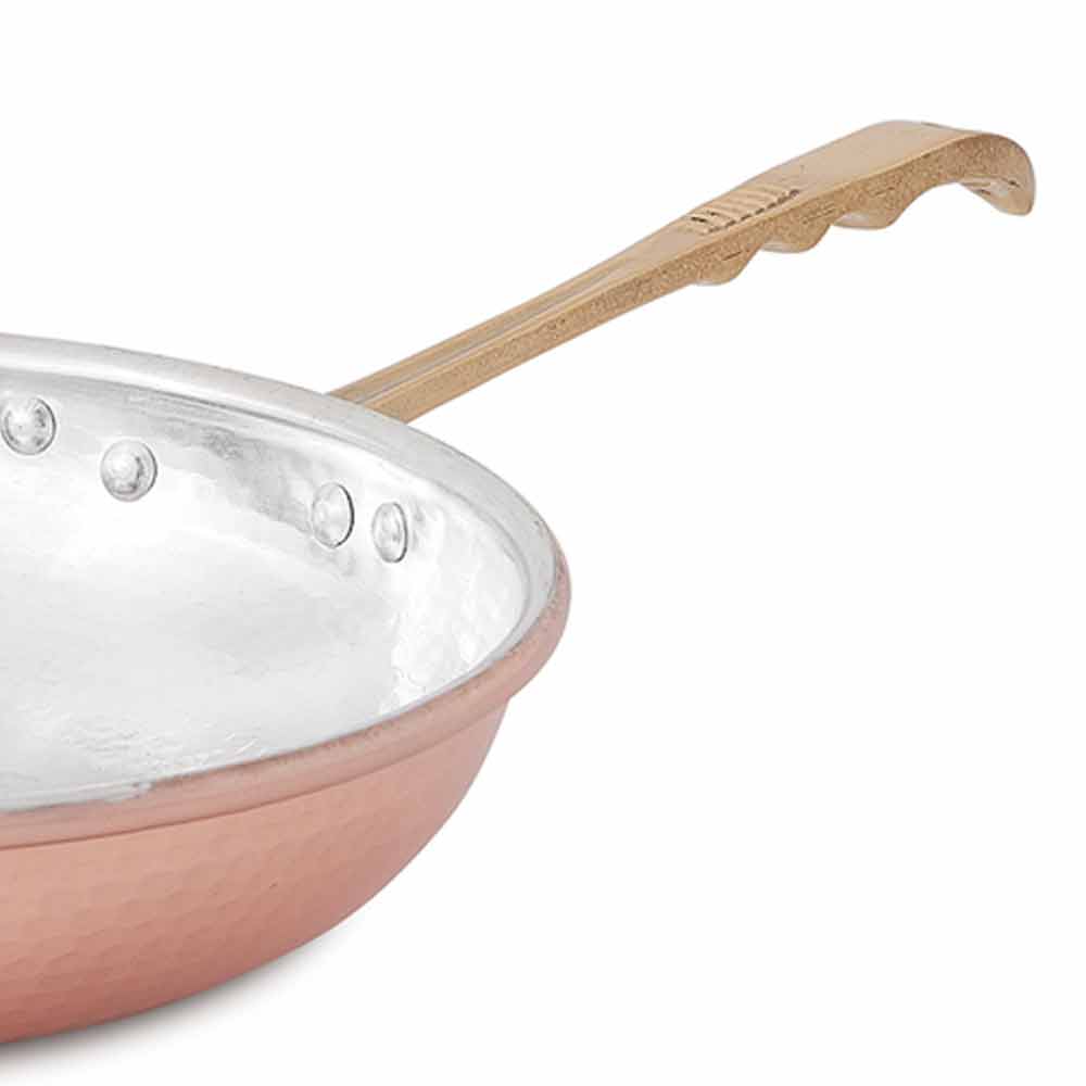 massivt kobber, der er hamret og fortinnet i hånden over ilden, er ideel til stegning, pandekager, sautering af pasta eller glasering af grøntsager.