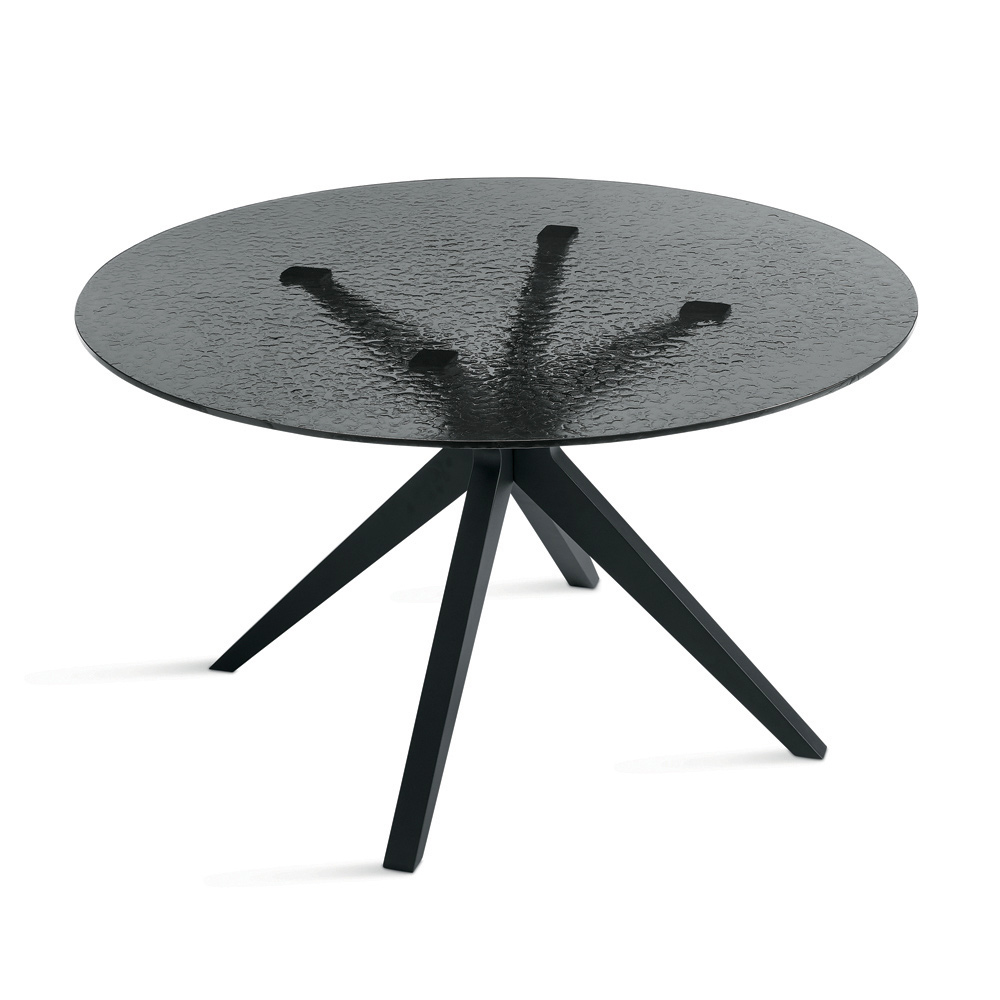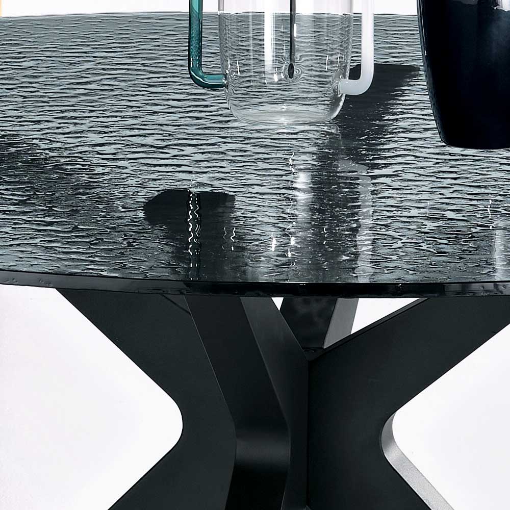 Et elegant rundt spisebord med et moderne design, ideelt til at tilføje et stilfuldt præg til din spisestue eller stue . Bordpladen er lavet af røget, hamret glas , en raffineret finish, der skaber en unik tekstureret effekt og tilføjer visuel dybde til rummet.