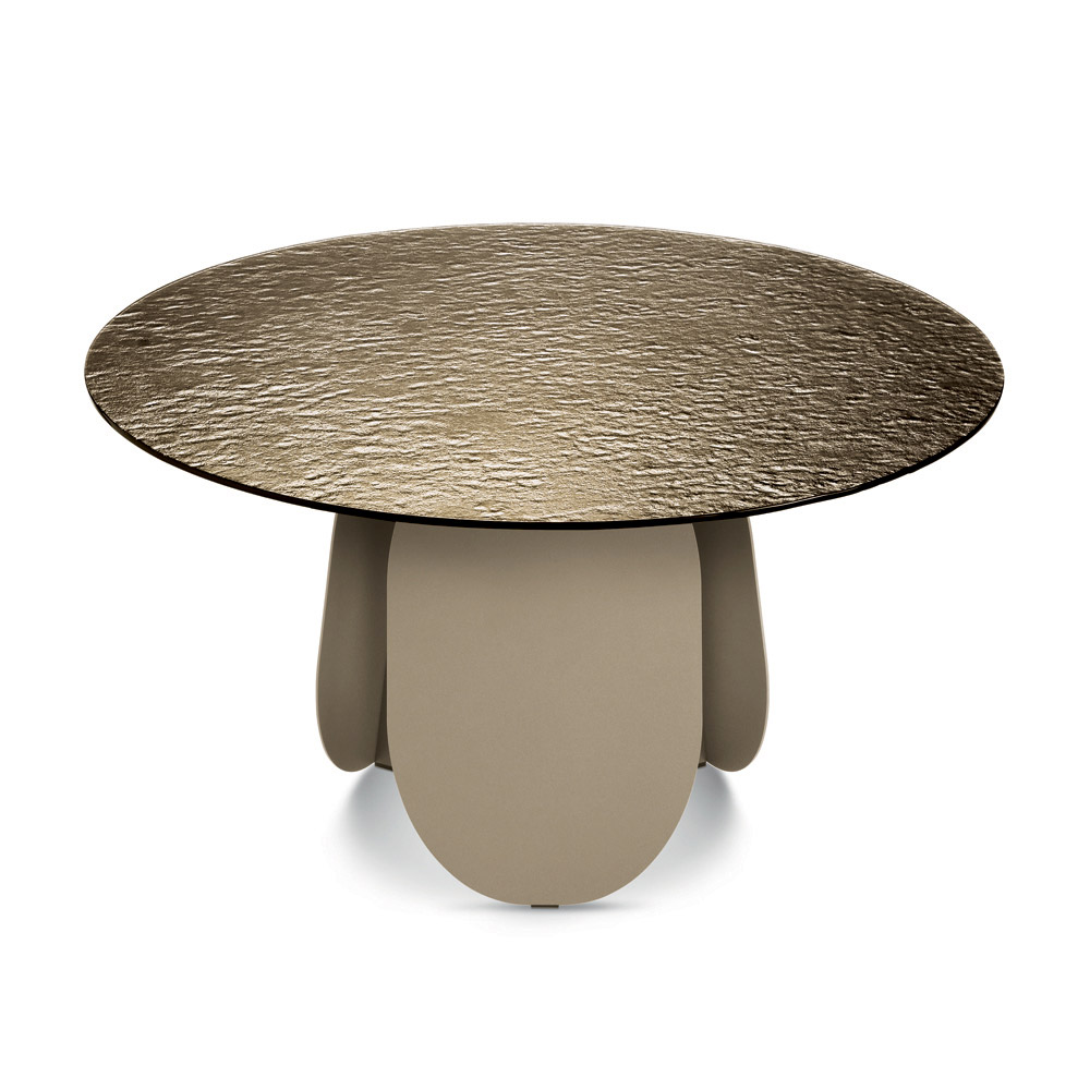 Den skulpturelle base er sammensat af tre malede metalben med en original form, der ligner vertikale geometriske elementer, der er blødgjorte og buede i enderne, hvilket giver stabilitet og en stærk visuel effekt.