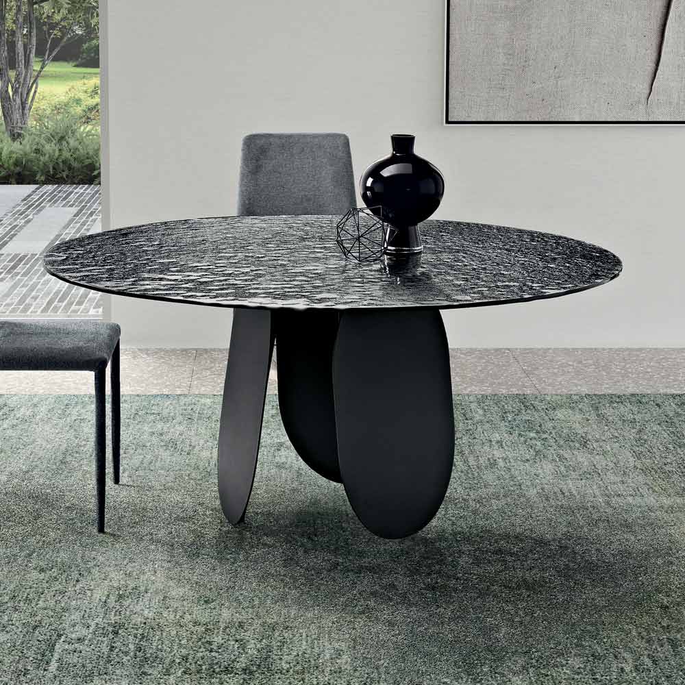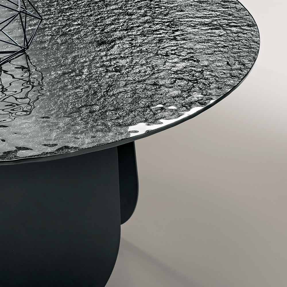 Et raffineret rundt bord, fremstillet i Italien , designet til at forbedre spisestuen eller stuen med en moderne og dramatisk æstetik. Den bagsidede sølvbelagte, hamrede glasplade reflekterer lyset med iriserende effekter, hvilket tilføjer lysstyrke og karakter til rummet.