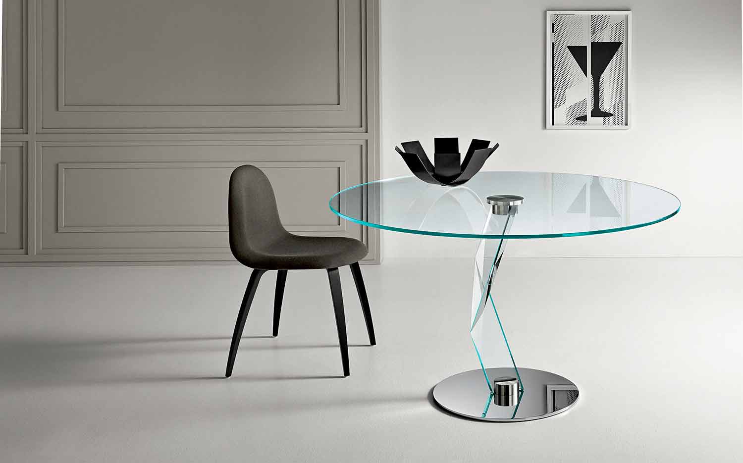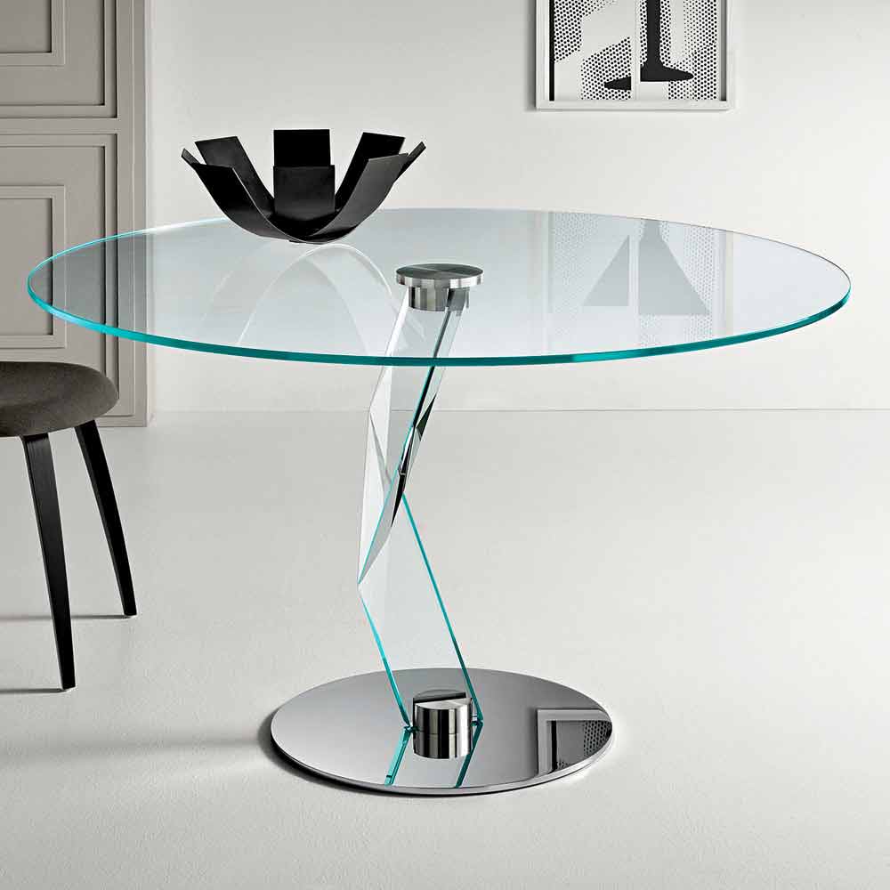 Rundt køkkenbord med ekstra klart glasplade og ekstra klart glas og forkromet metalbund i moderne design, fremstillet i Italien.