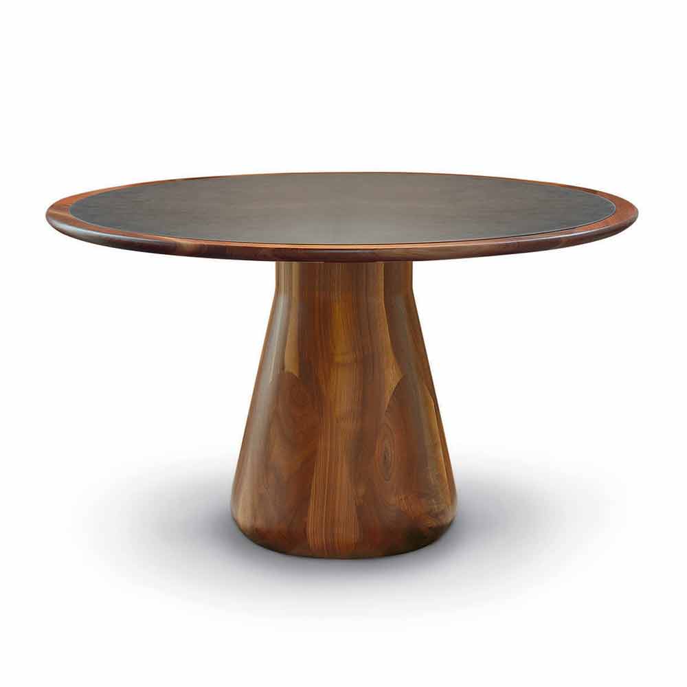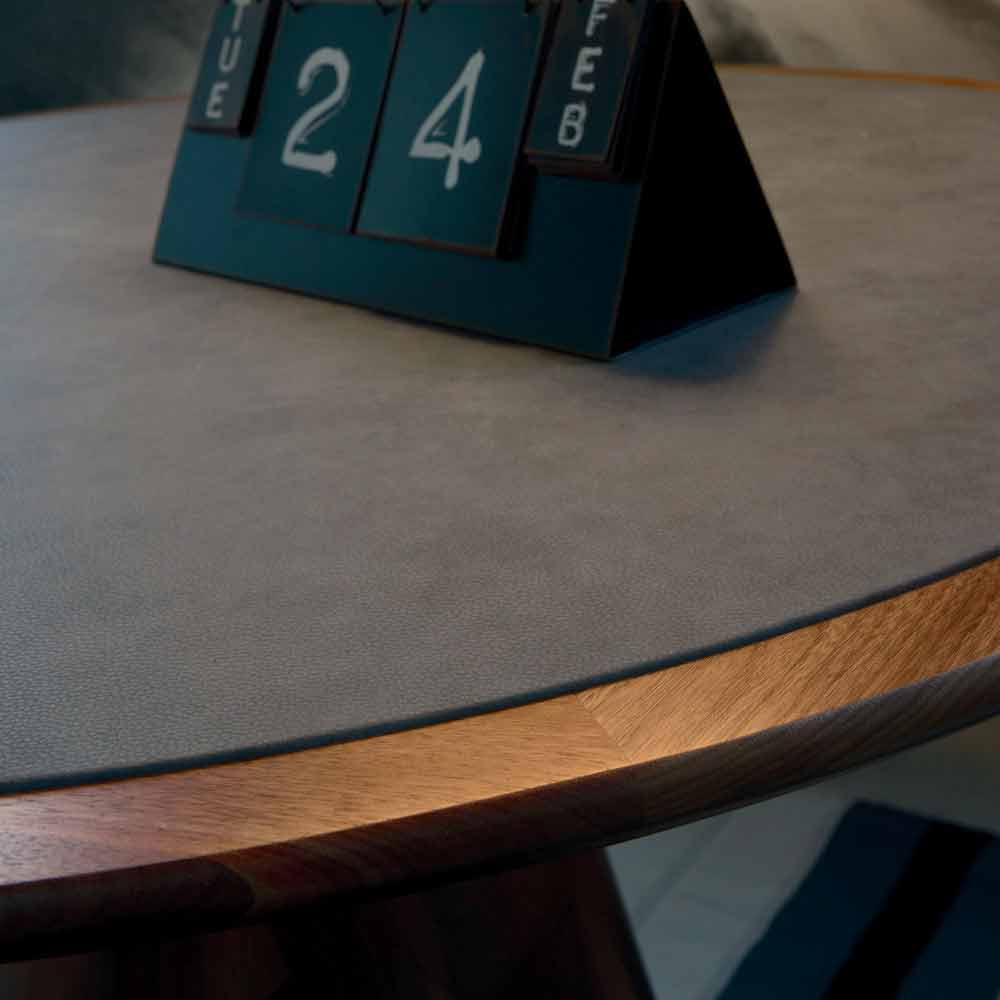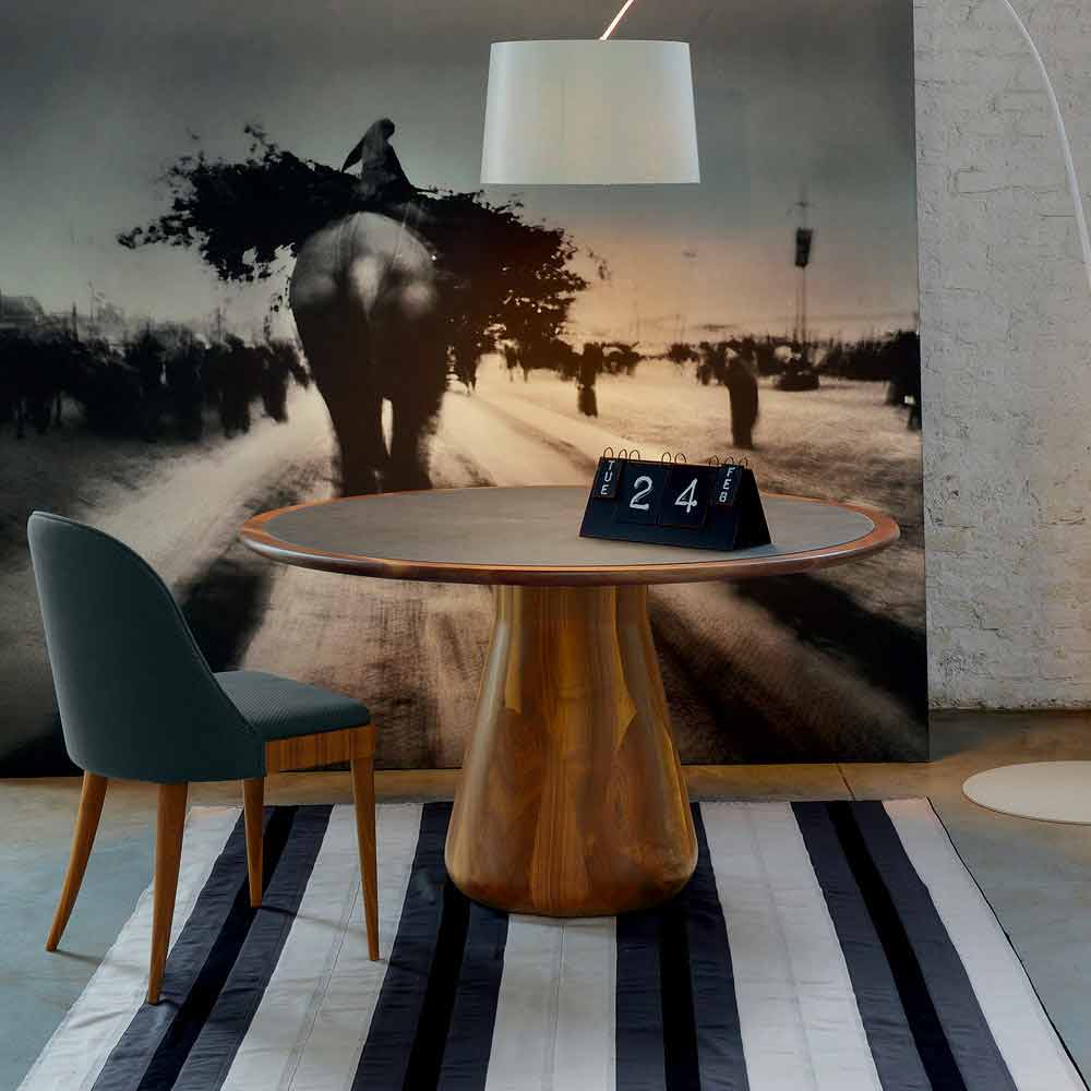 Fast rundt bord med plade af massiv valnød. Fod i massiv drejet Canaletto valnød. Carlo har rene funktioner og linjer, der formår at øge hans værdi. Fremstillet af naturlig valnød og overfladebehandlet i olie viser den den særlige stilistiske raffinement med formen på bunden og toppen beklædt med øko-læder.