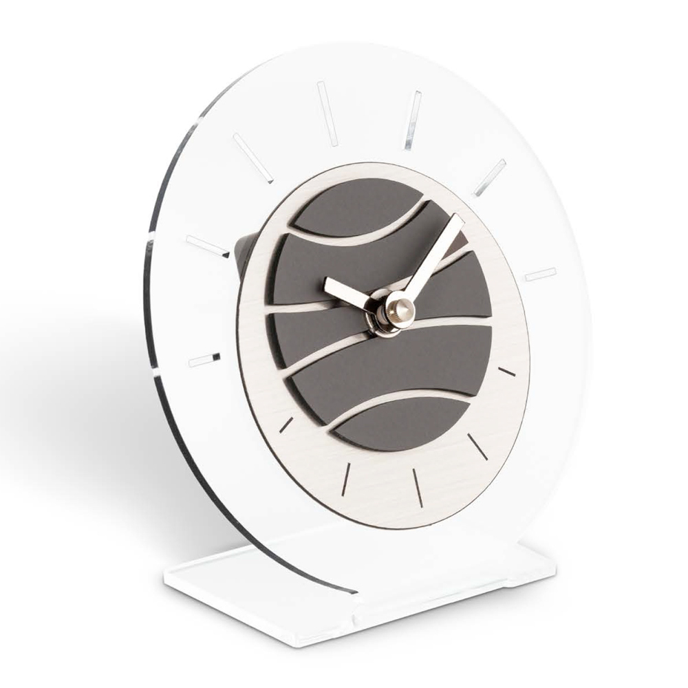 Dette bordur er et mesterværk af moderne design og innovation . Med sin stabile base og cirkulære urskive fremkalder den en fornemmelse af tid i suspension . Hænderne bevæger sig yndefuldt på en skive, der spiller på vekslen mellem tom og fuld, og tilbyder en dynamisk og unik visuel oplevelse.