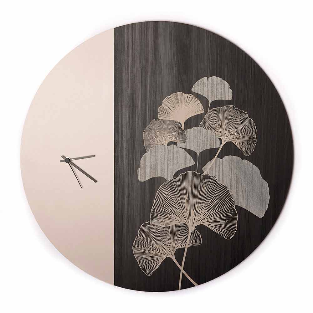 Vægur i træ med lasermærket dekoration, rundt design i to finish fremstillet i Italien.