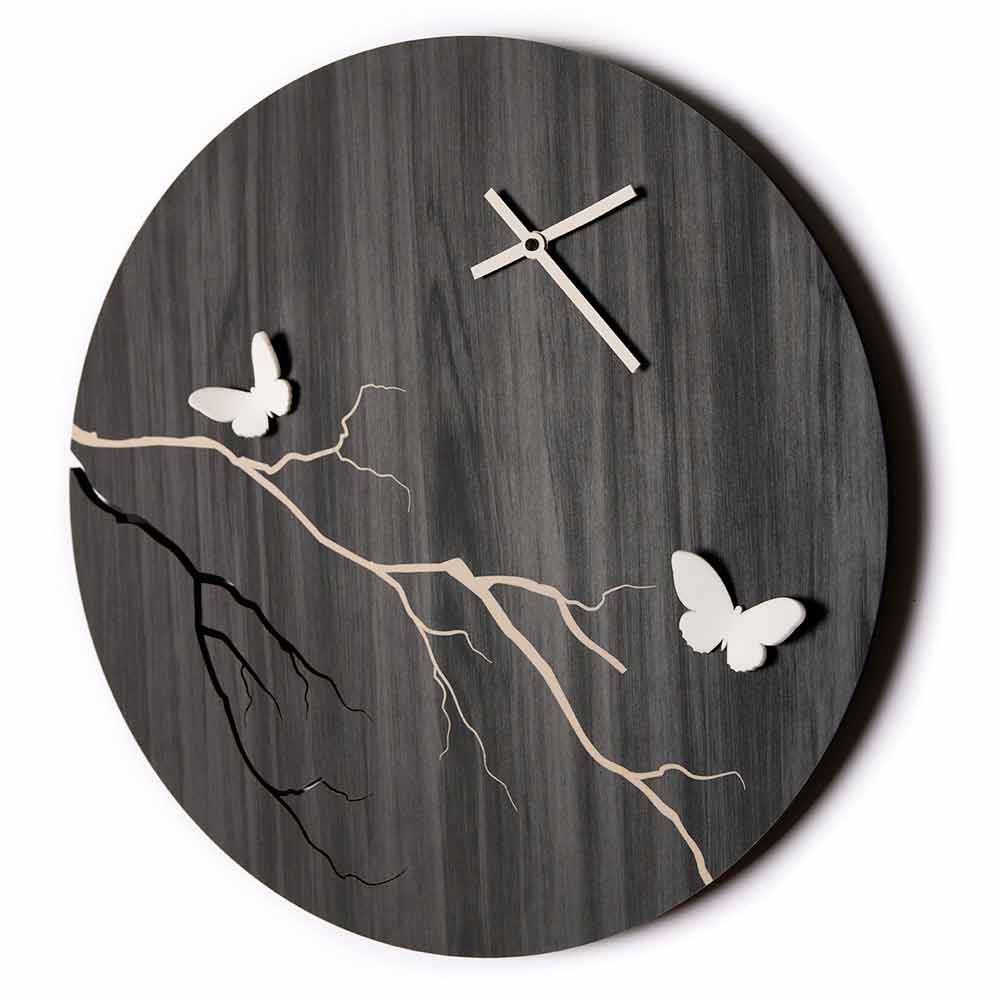 Rundt trævægur med lasergraverede dekorationer og tredimensionelle sommerfugle, fremstillet i Italien.