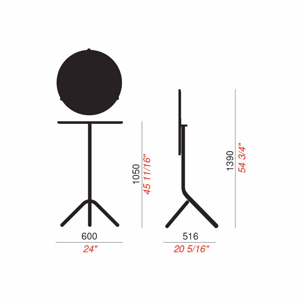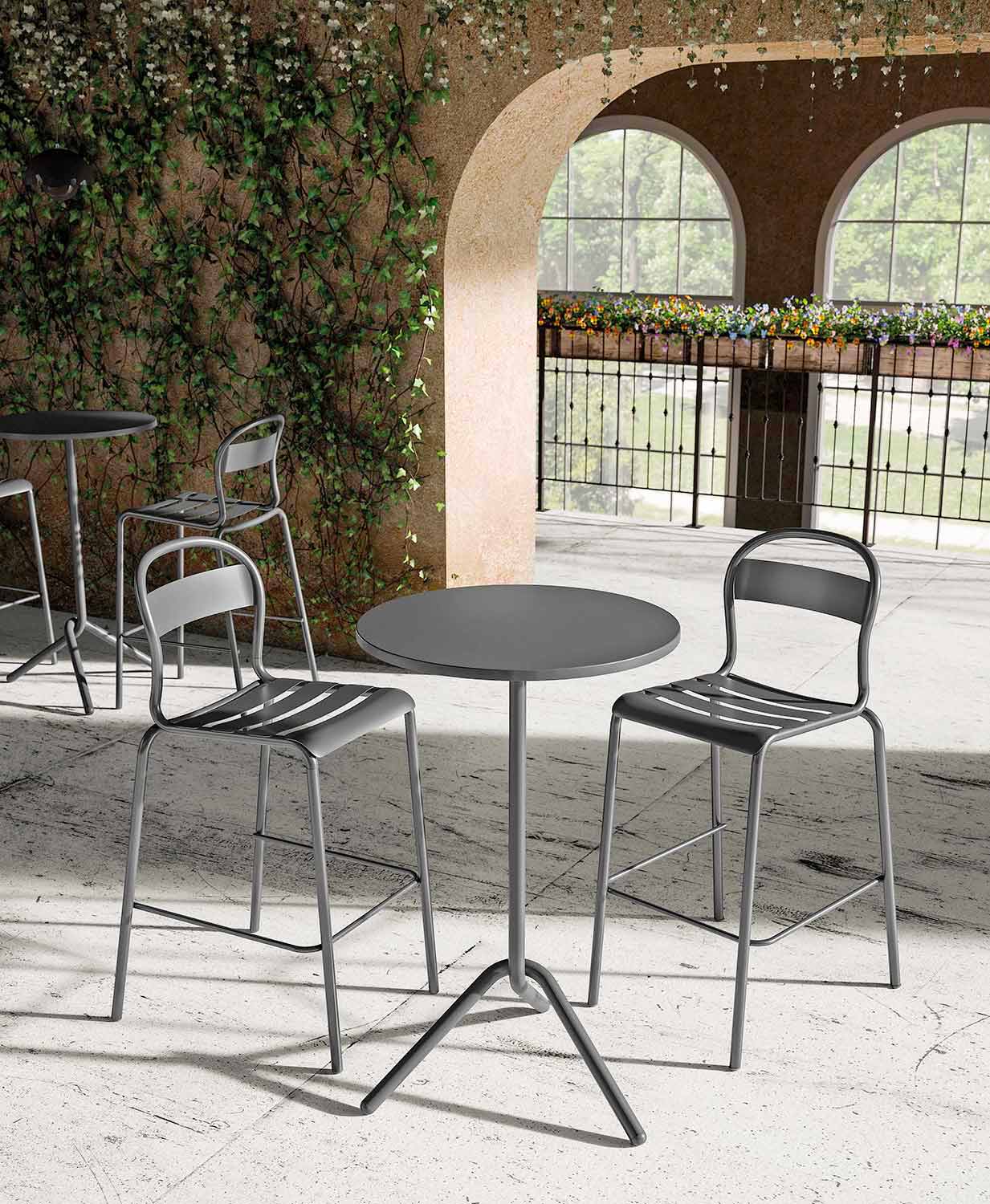 Udendørs rundt højt bord i metal og stabelbart og sammenfoldeligt metalplade Fremstillet i Italien.