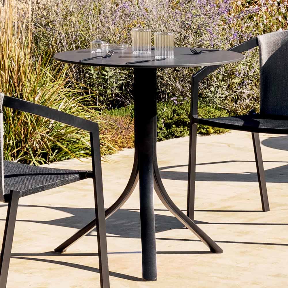 Rundt udendørs barbord med liggende design i aluminium og hpl i 2 finish, fremstillet i Italien.