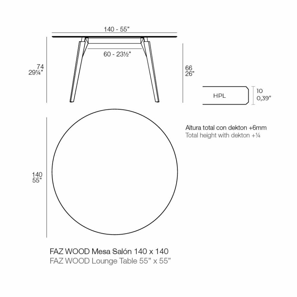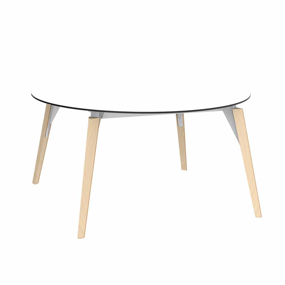 Rundt sofabord med ben i lys eller mørkt asketræ og hpl-top i forskellige finish og 2 størrelser.