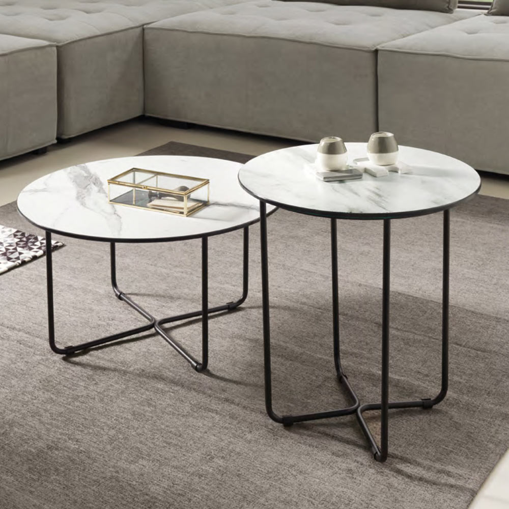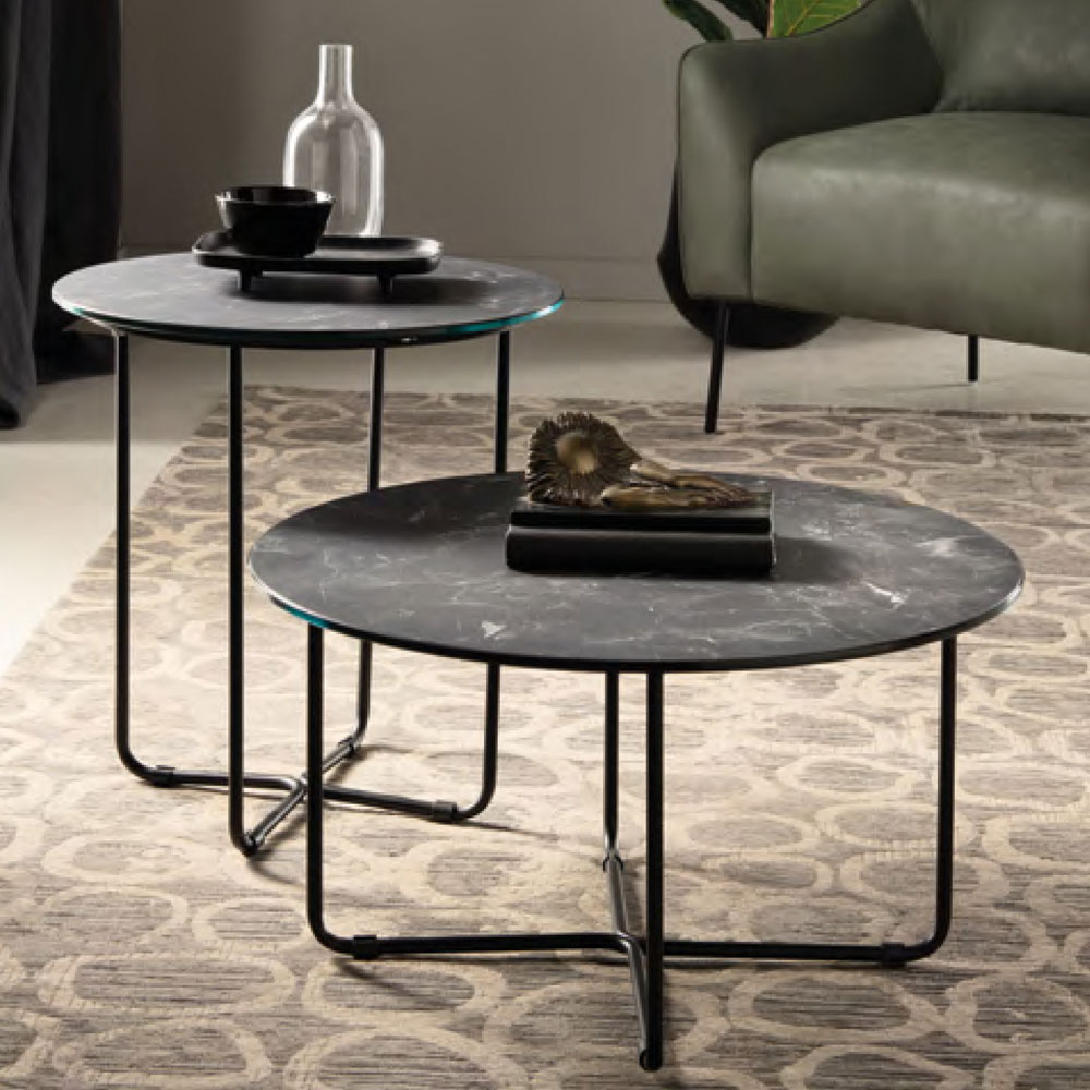 Sofabord med rund glasplade med marmoreffekt Made in Italy.