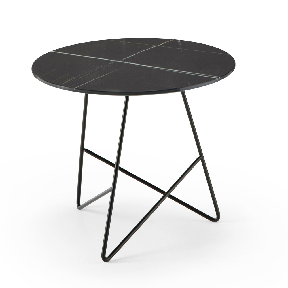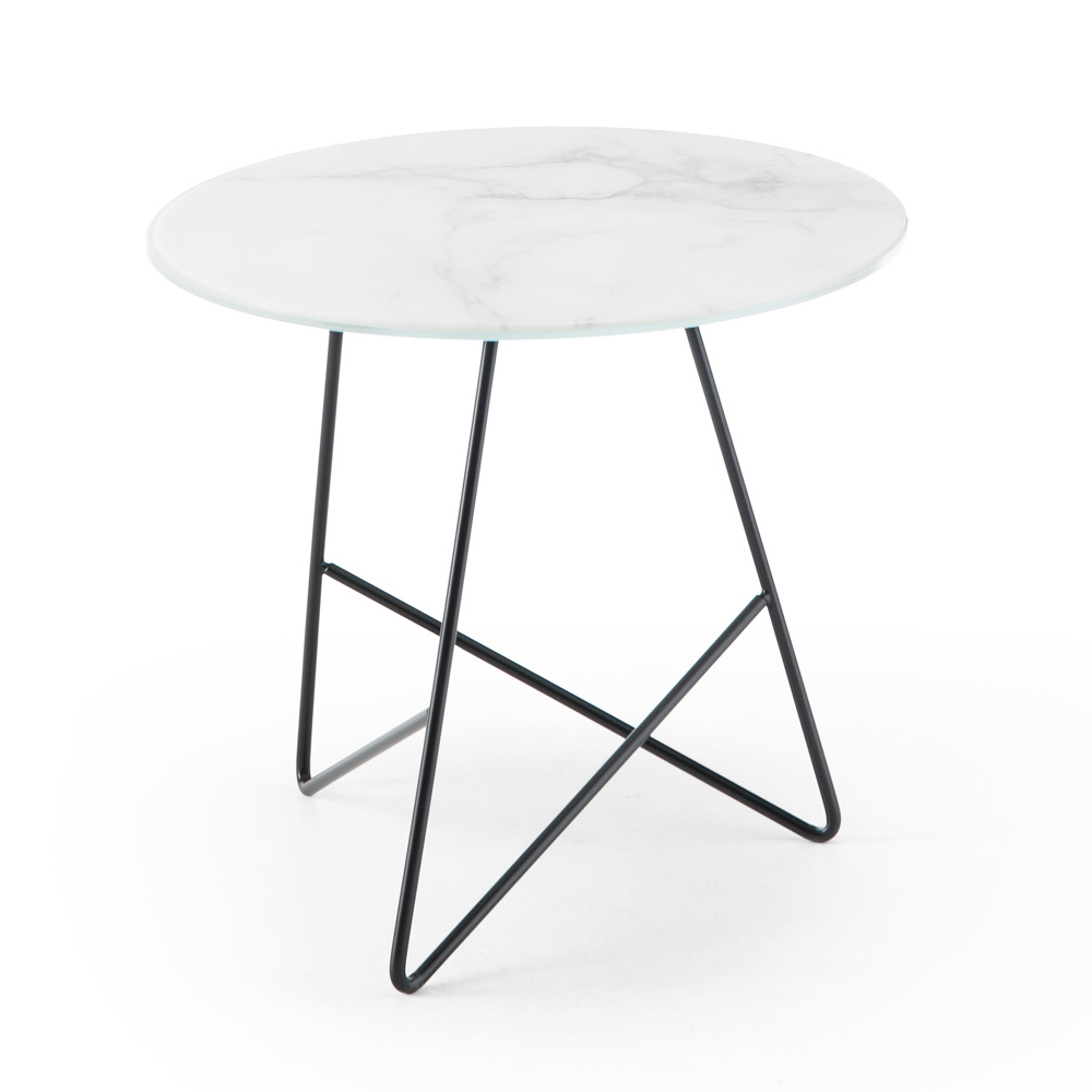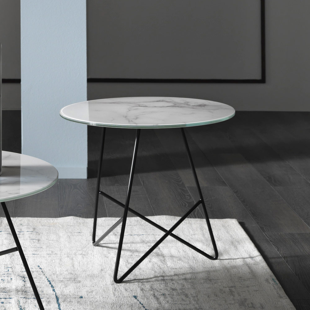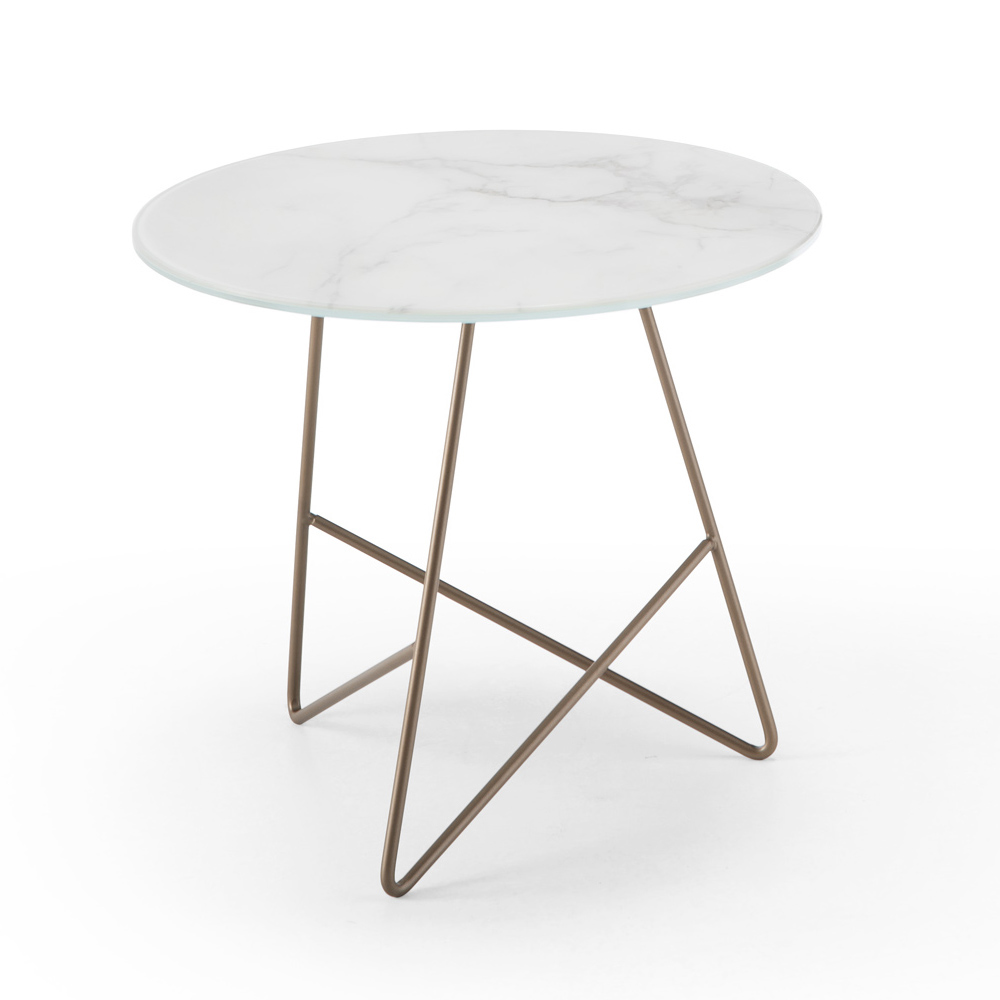 Rundt sofabord i metal og glasmarmorplade, luksusartikler lavet i Italien.
