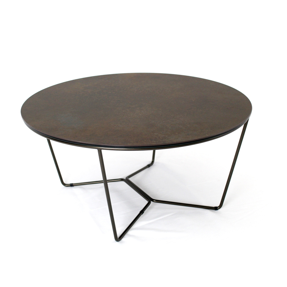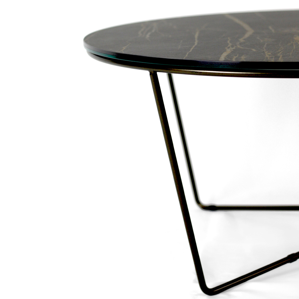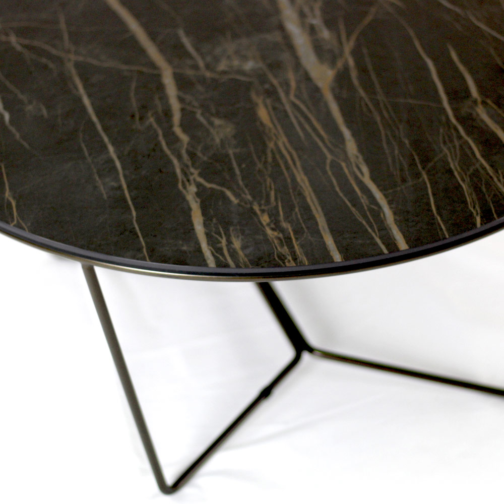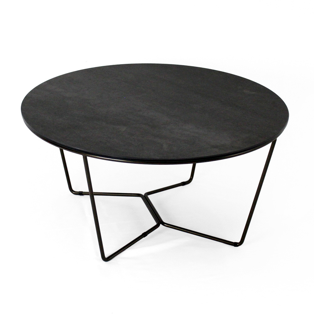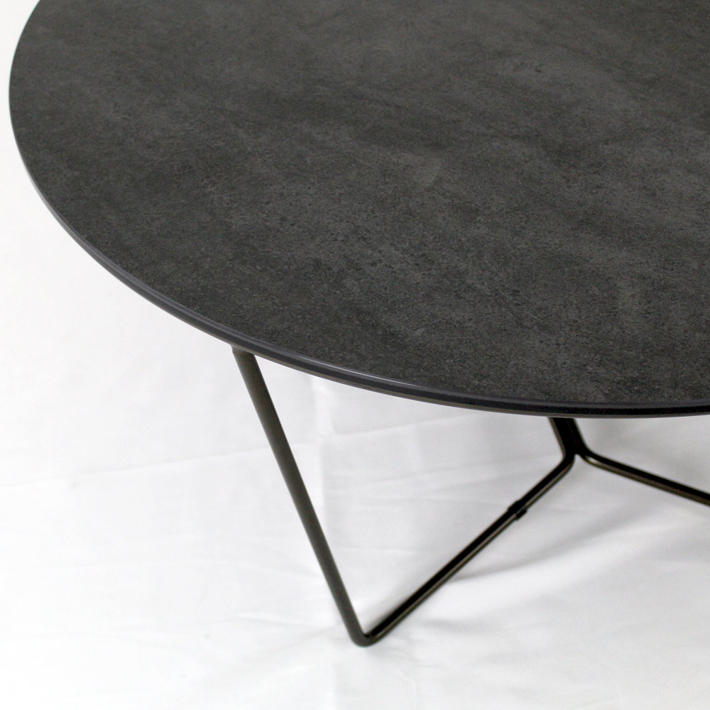 Rundt sofabord med understel af malet stål og top af porcelæn i stentøj.