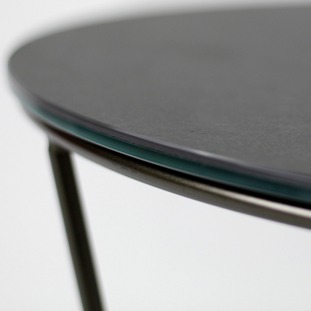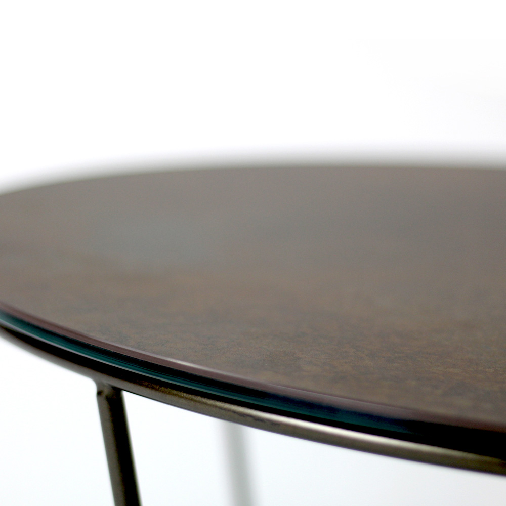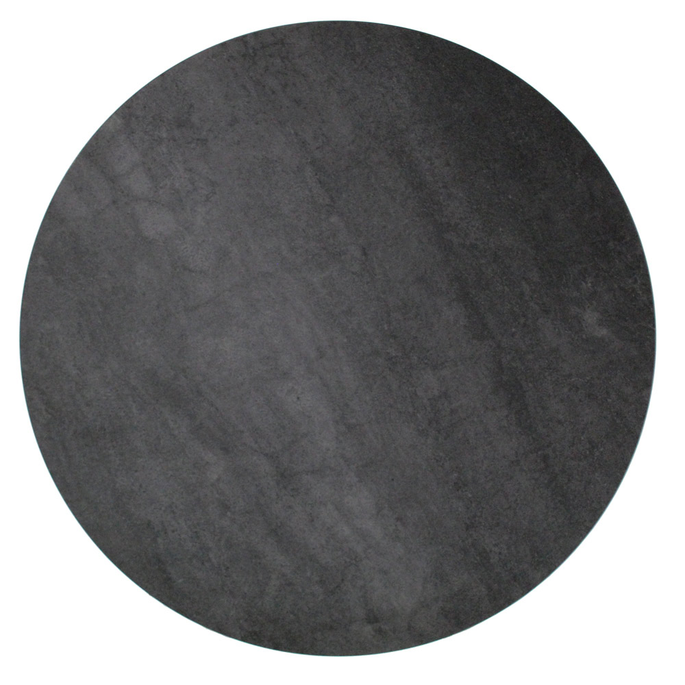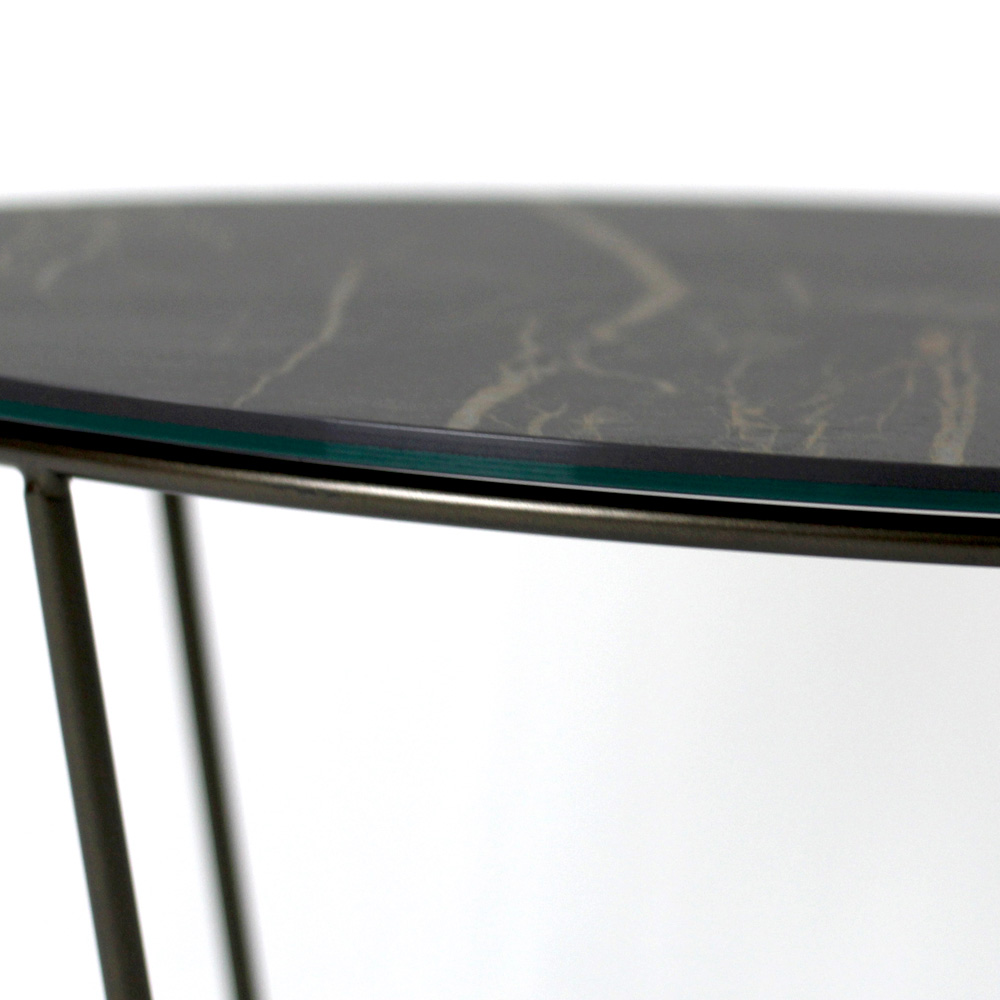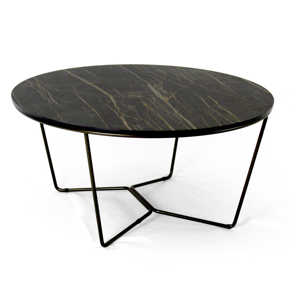 Rundt sofabord med understel af malet stål og top af porcelæn i stentøj.