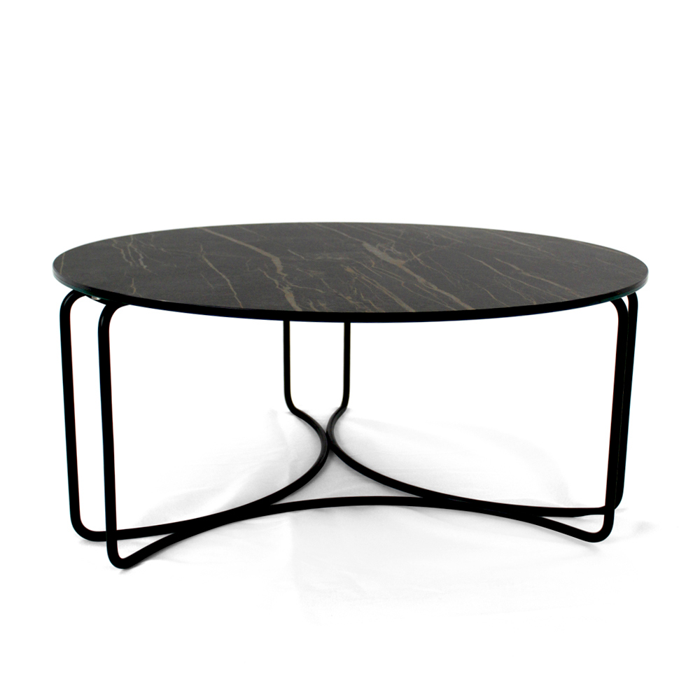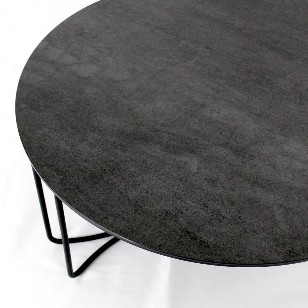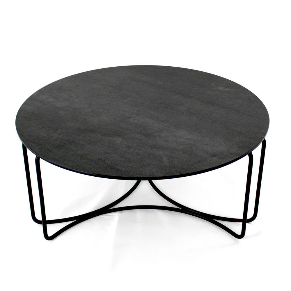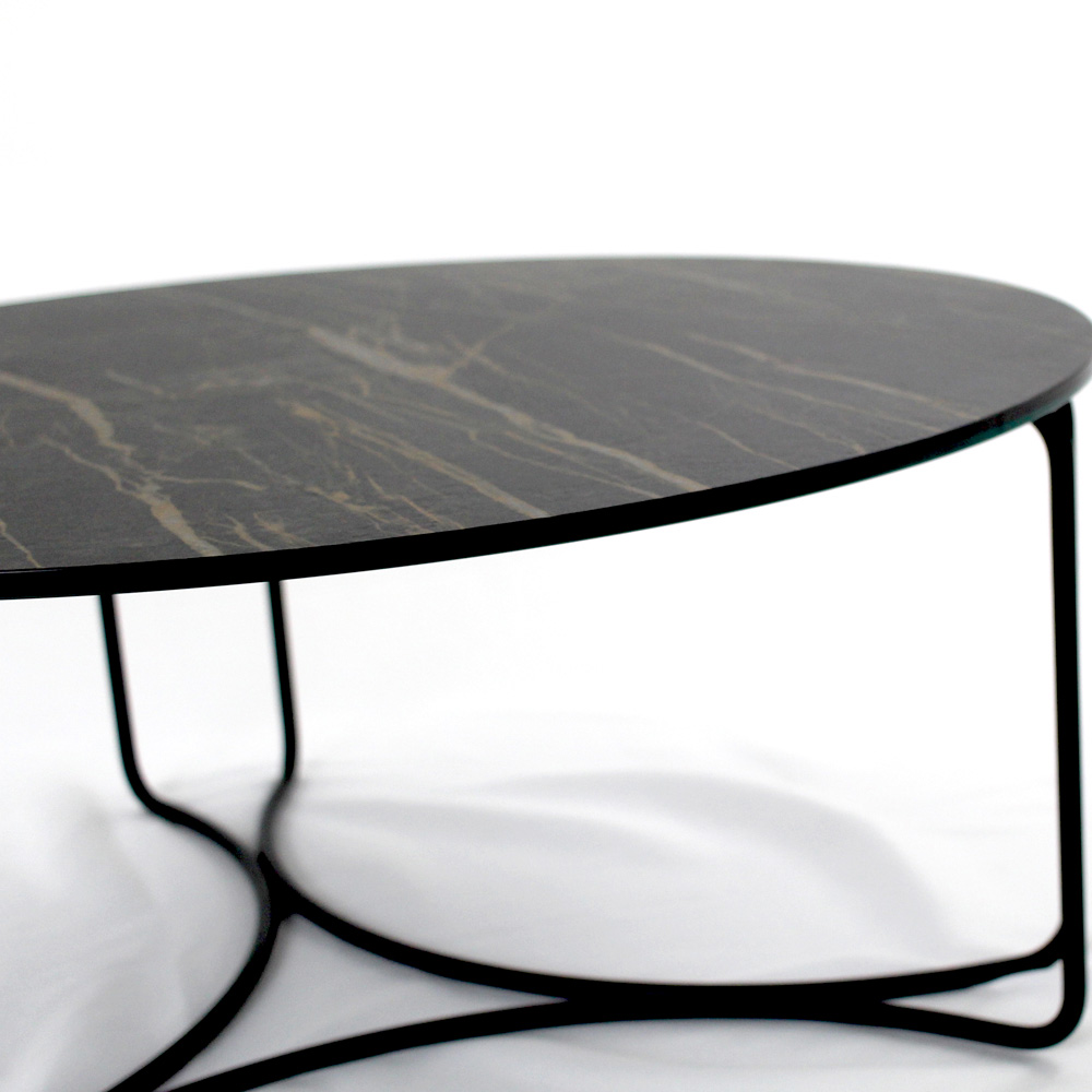 Rundt sofabord med understel af malet stål og top af porcelæn i stentøj.